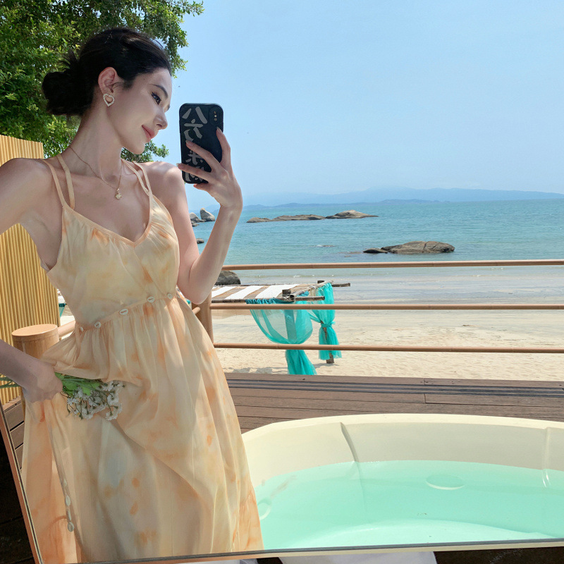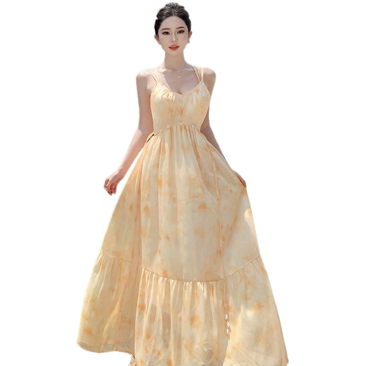 金盏风铃法式晕染吊带连衣裙夏海边度假风大裙摆长裙海岛穿搭裙子