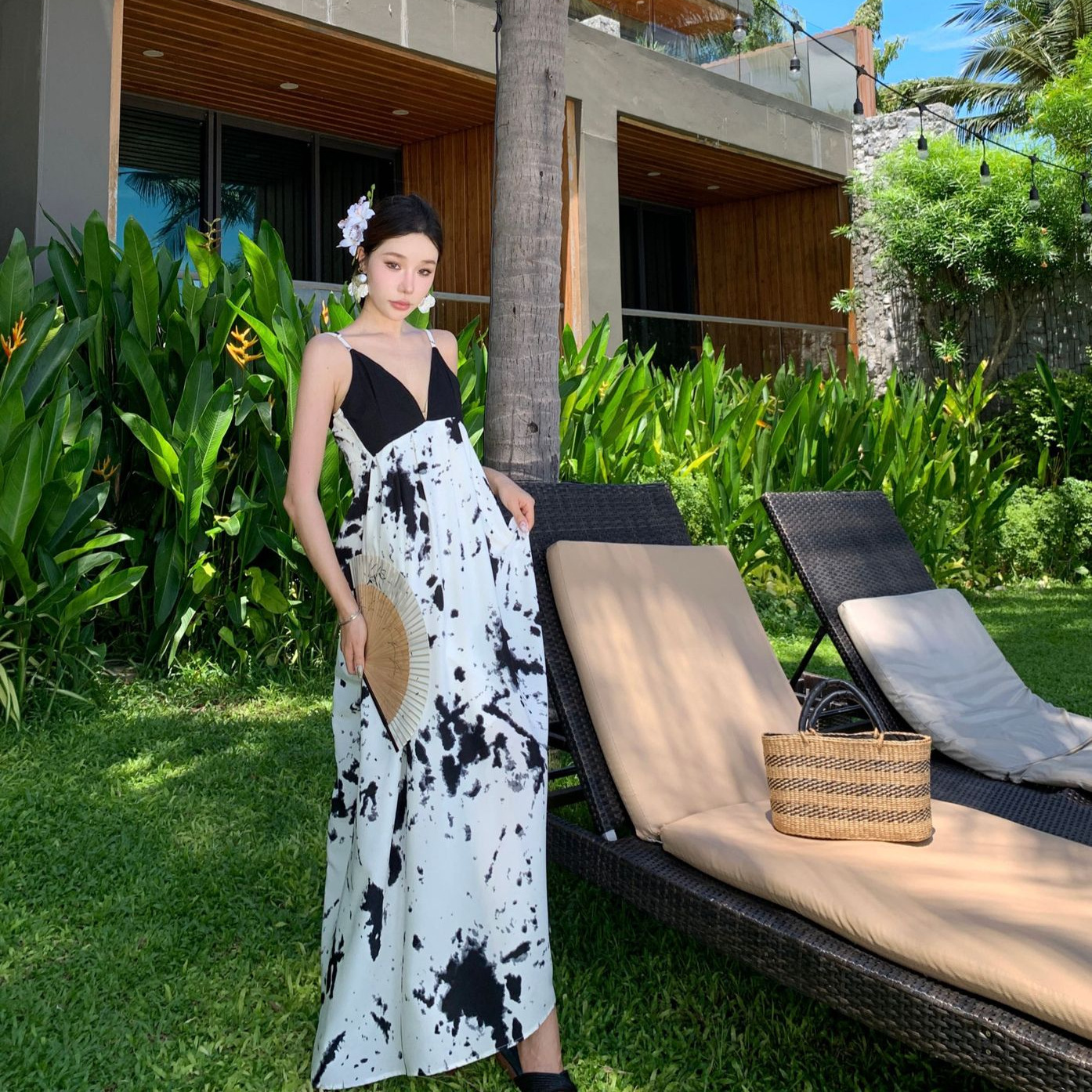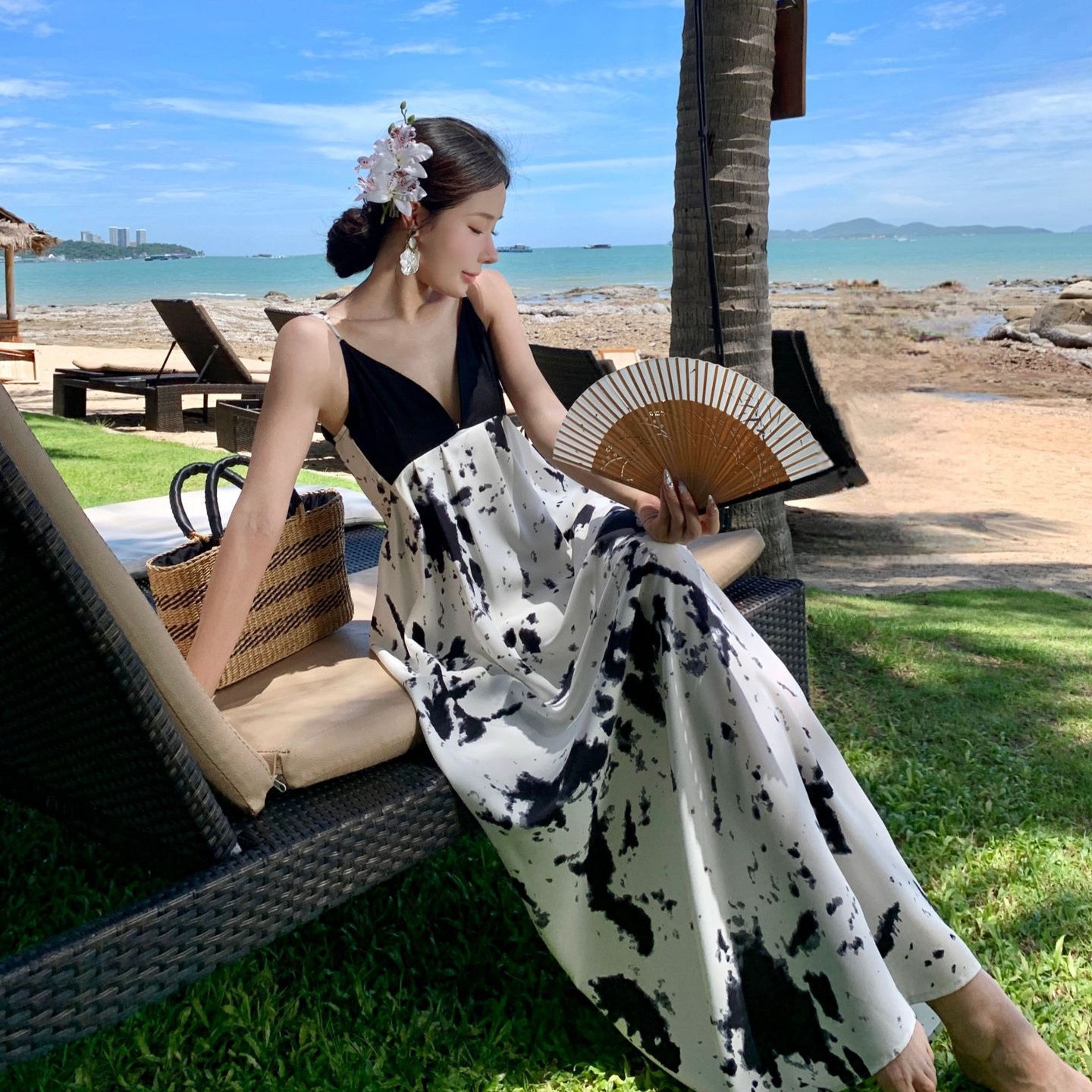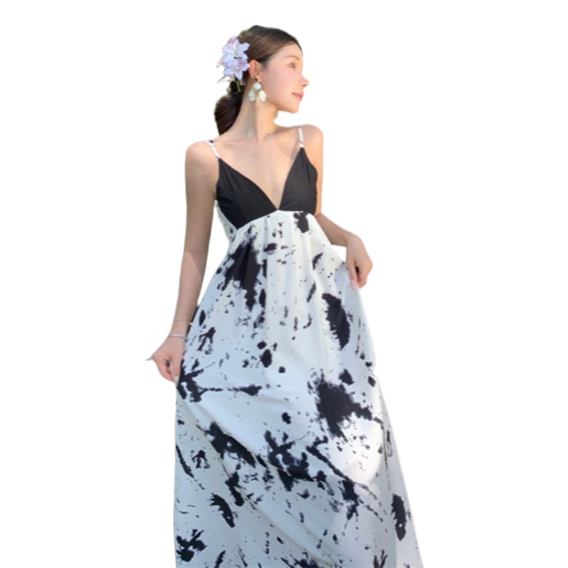 新中式V领水墨黑白拼接高级感碎花长裙吊带连衣裙海边度假长裙子