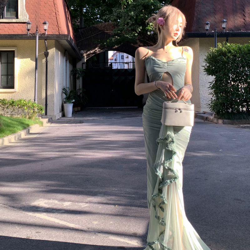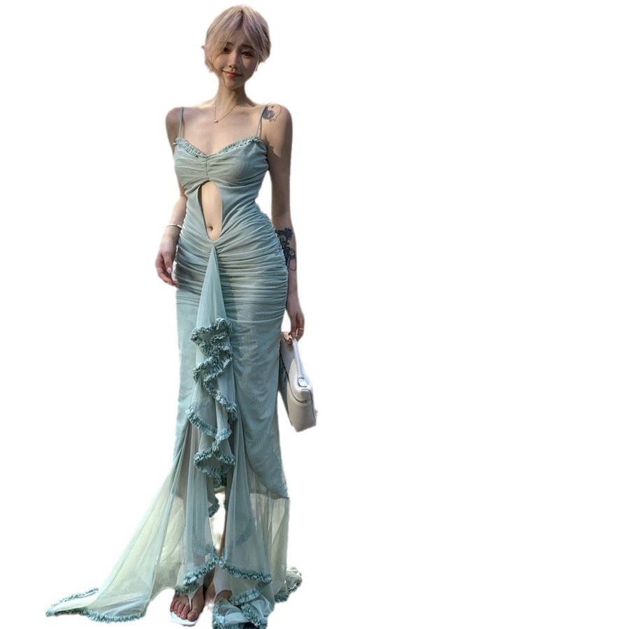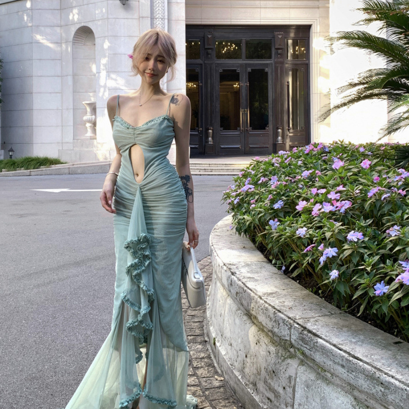只此青绿纯欲性感镂空露脐荷叶边开叉鱼尾连衣裙度假风拖尾长裙子
