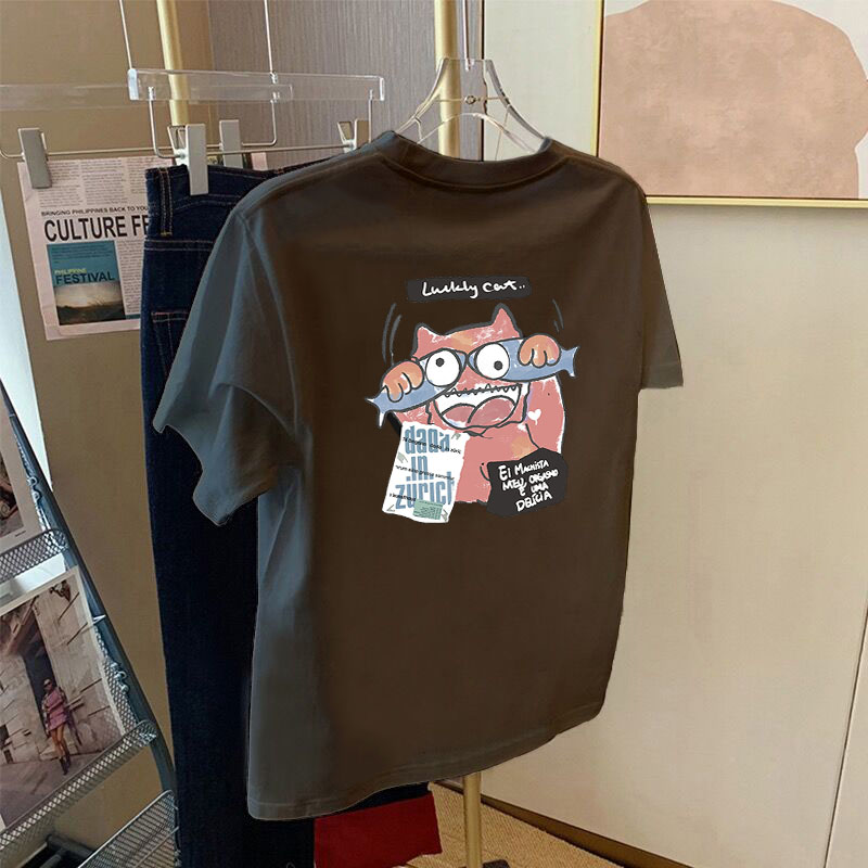 2025夏季新款正肩纯棉灰色短袖t恤女宽松百搭卡通印花设计感上衣