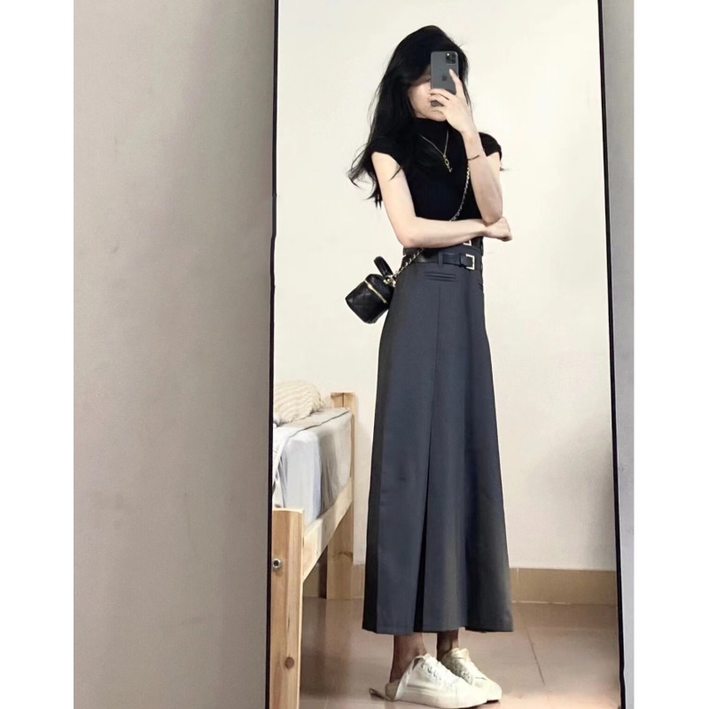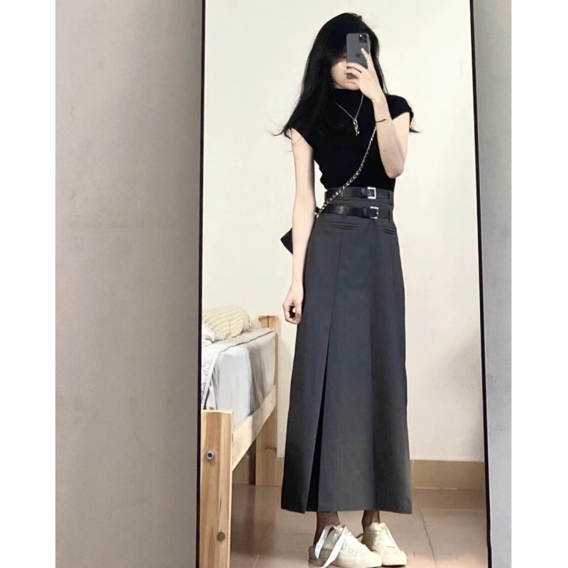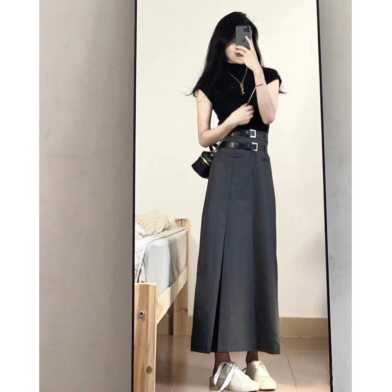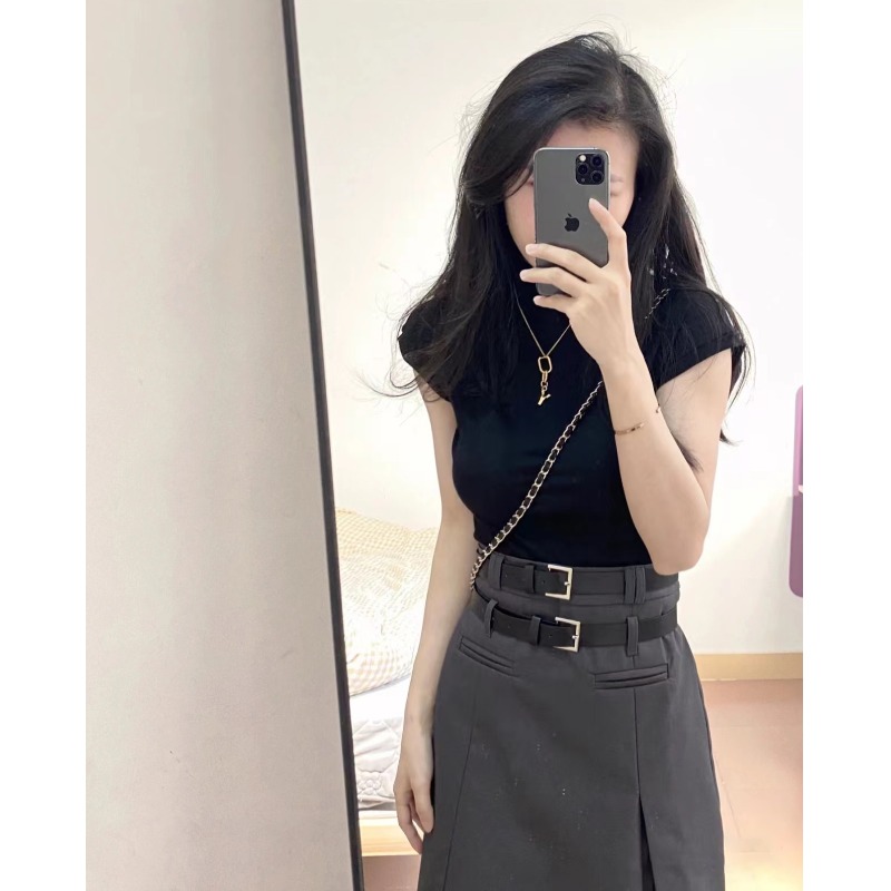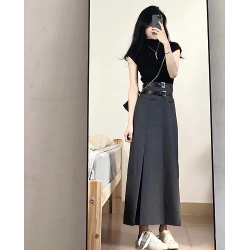 - 黑色半高领短袖上衣+灰色百褶半身裙+双皮带【今年流行