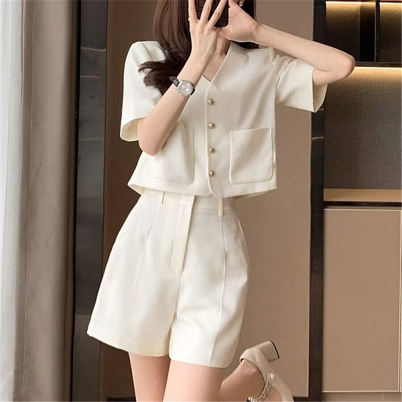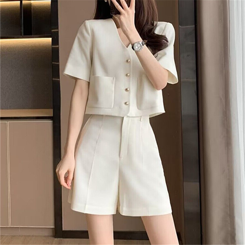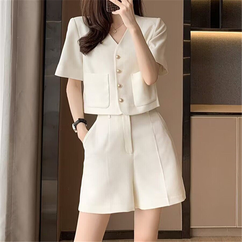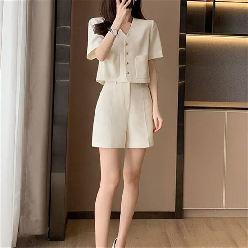小香风高级感套装女夏季新款小个子米白色上衣阔腿短裤两件套
