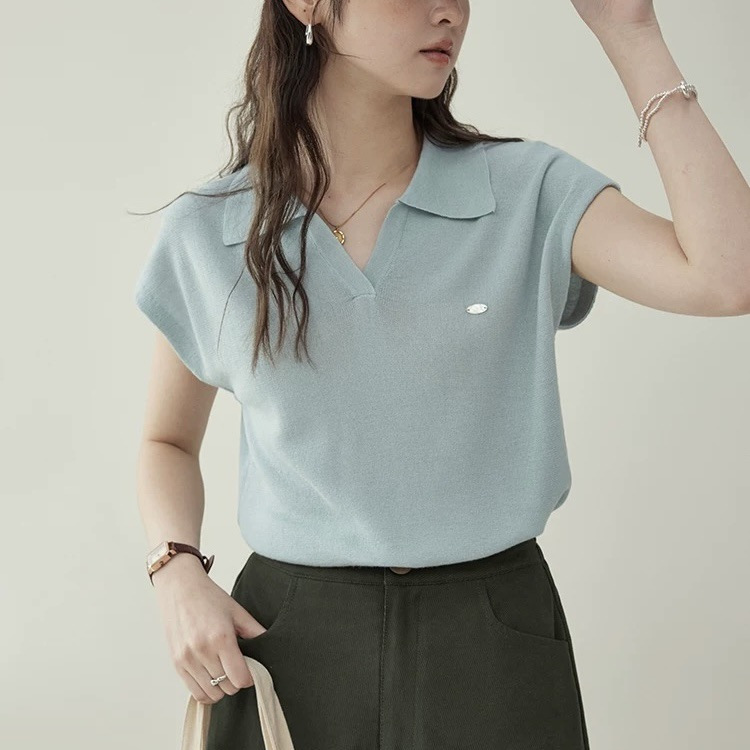 「北岛」法式纯色v领插肩袖针织t恤女夏新款收腰显瘦休闲上衣