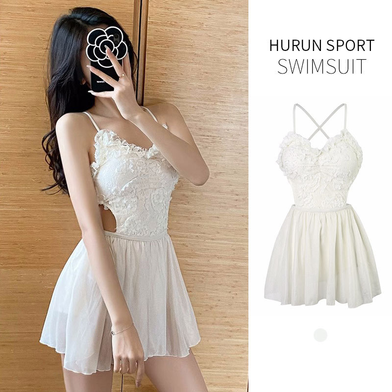 网红风轻奢感白色蕾丝吊带显瘦裙式连体泳衣女款夏仙遮肉性感遮肚