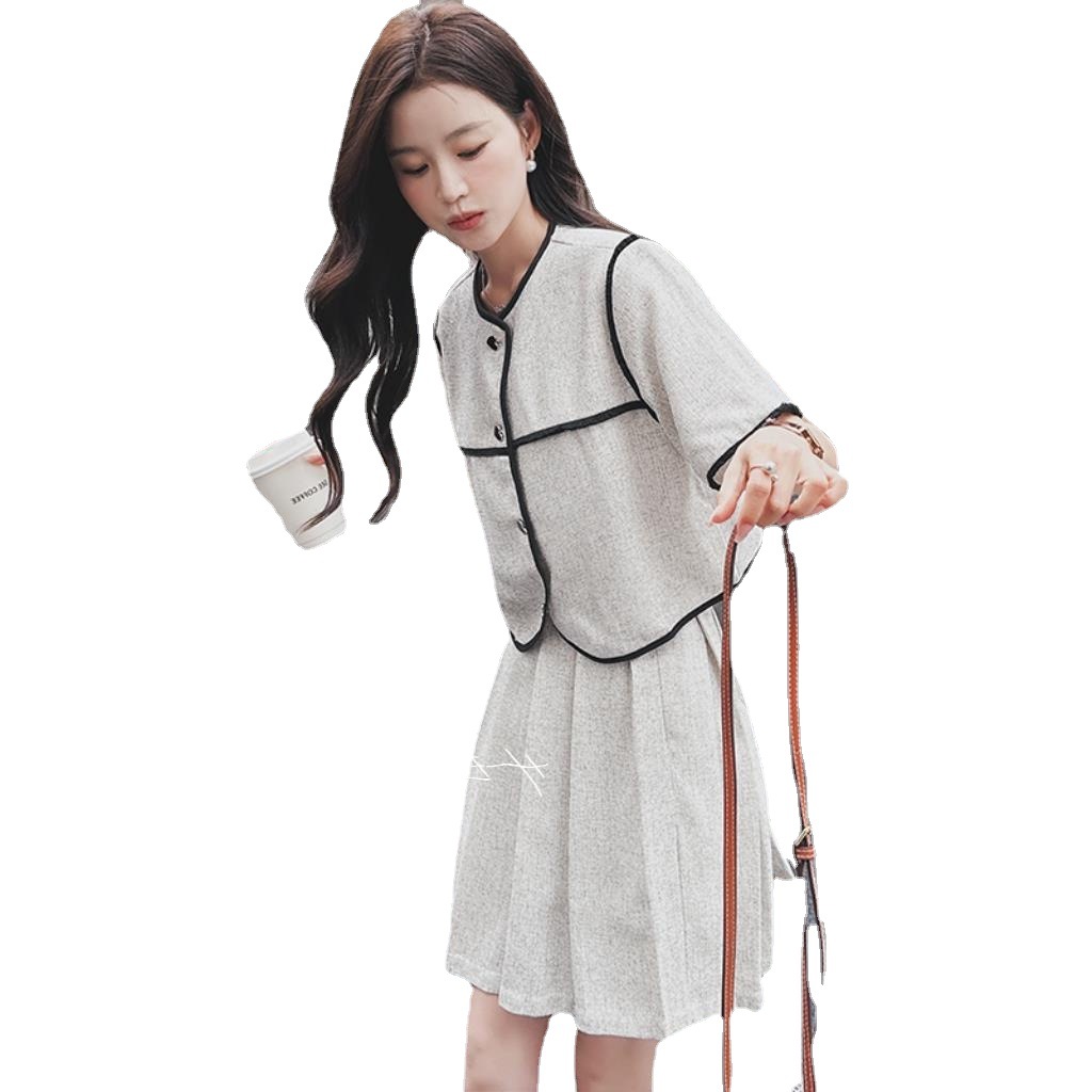 实拍小香风套装裙女夏季轻奢高级感小个子显高米白色半身裙两件套