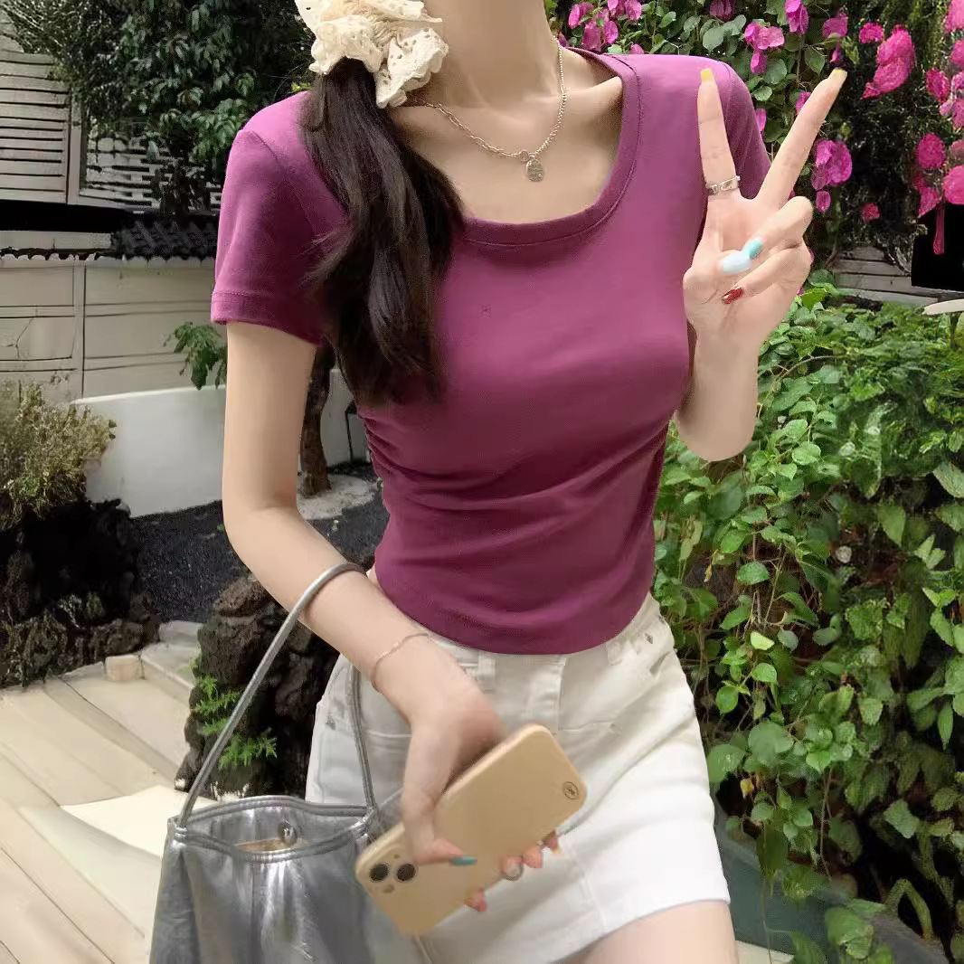 小众设计感侧边褶皱显白紫色短袖T恤女辣妹U领高腰显瘦夏季短上衣
