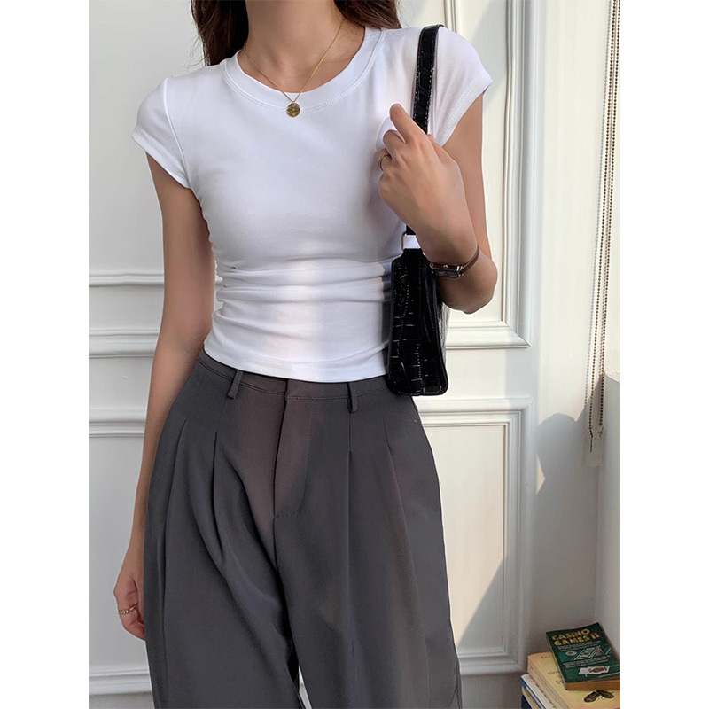 正肩修身显瘦高腰夏季短袖T恤女设计感小众抽褶收腰短款体桖上衣