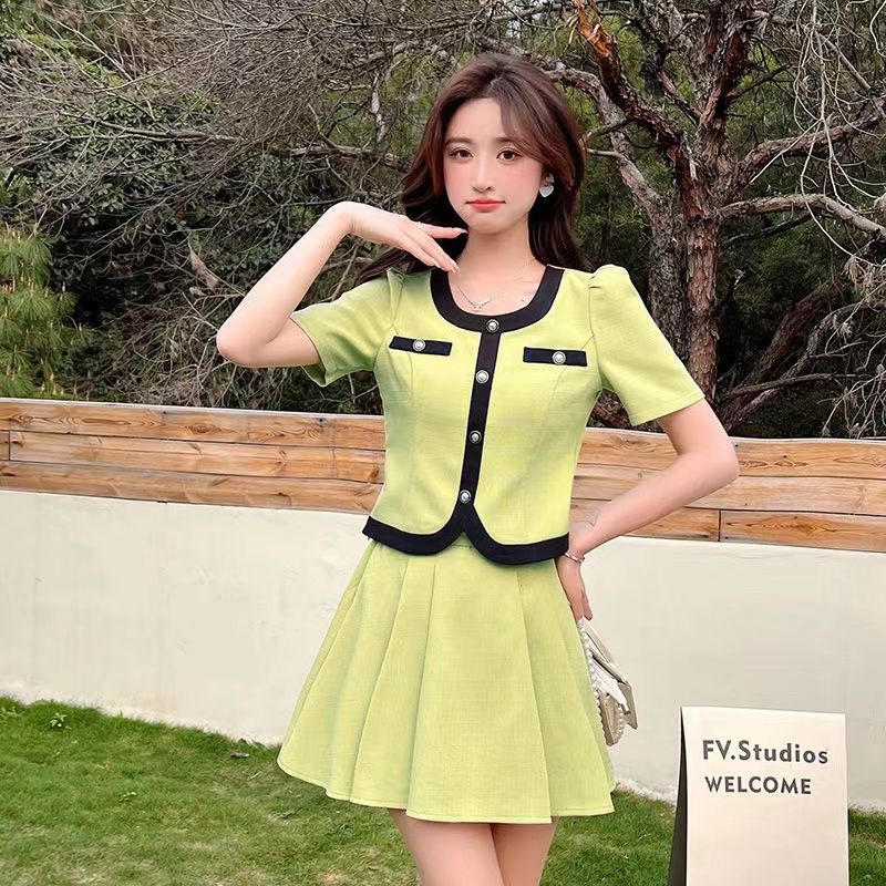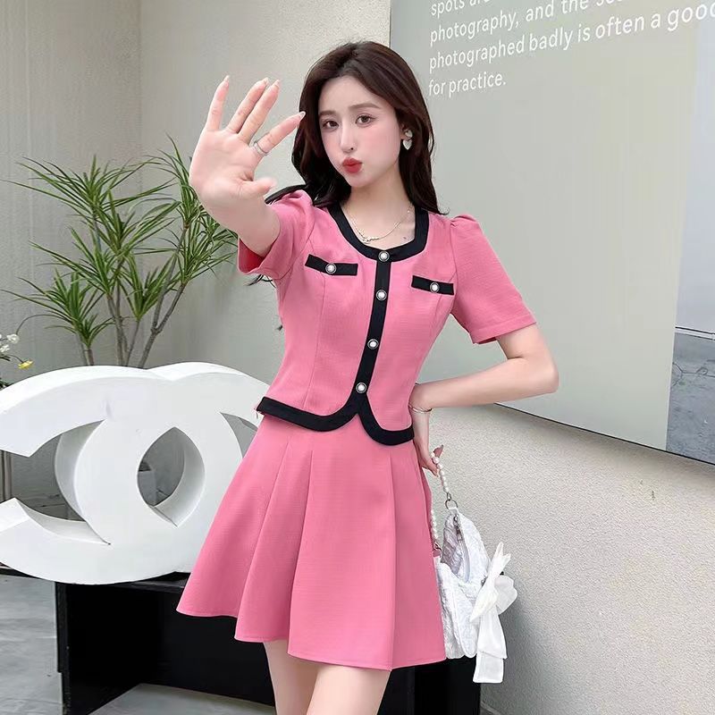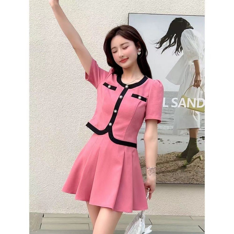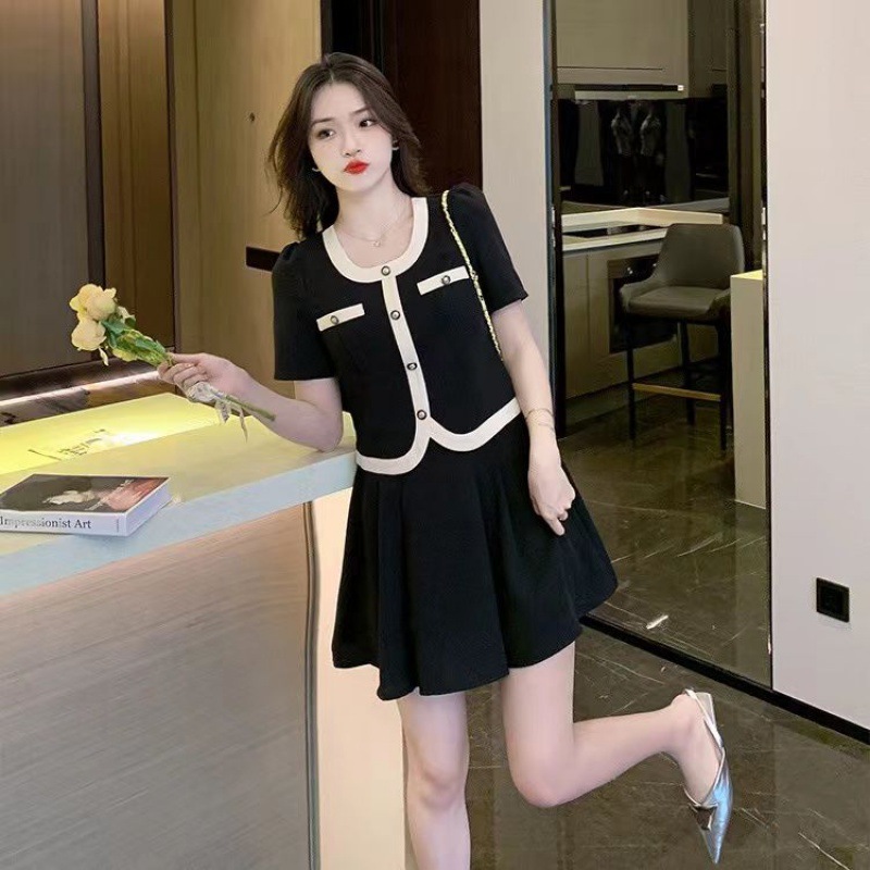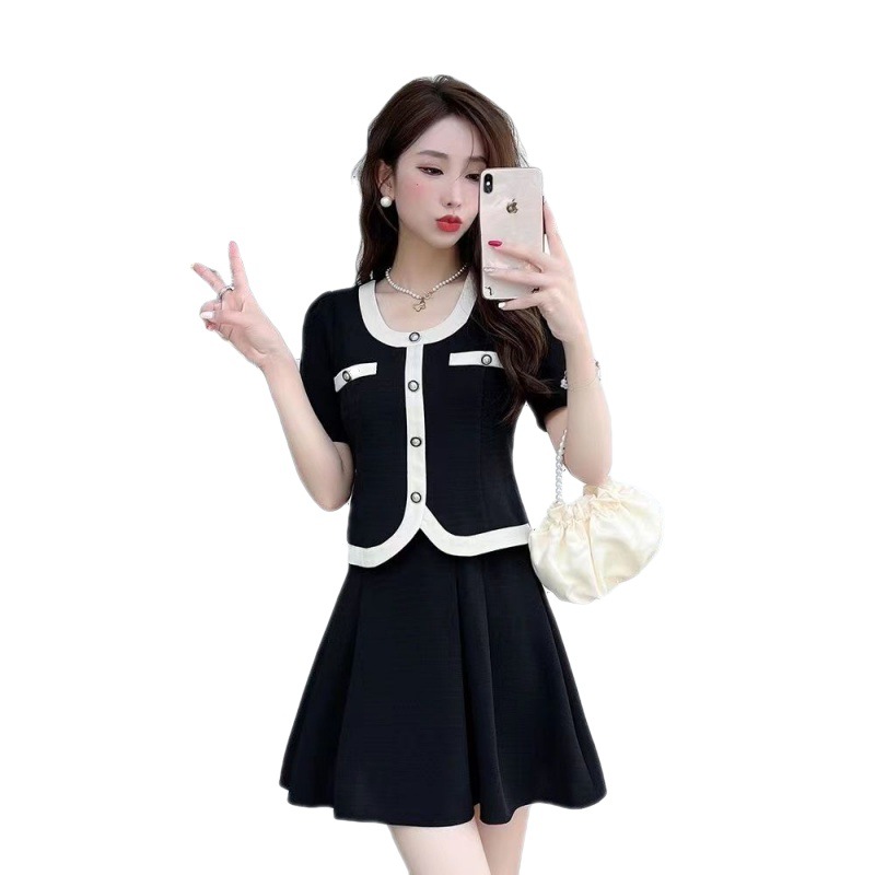 大码女装夏装时尚两件套胖撞色圆领小香风短裙甜辣小个子套装裙