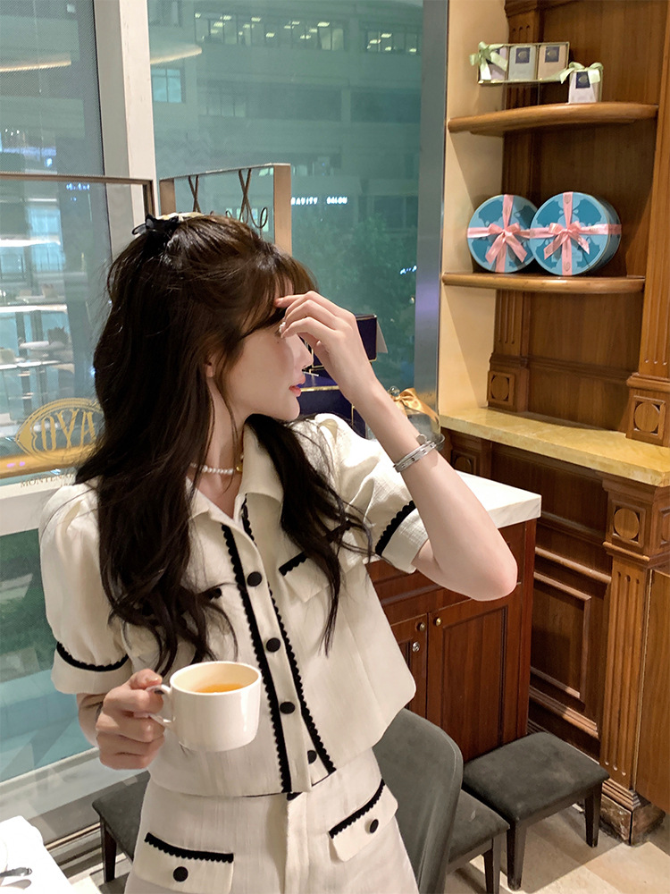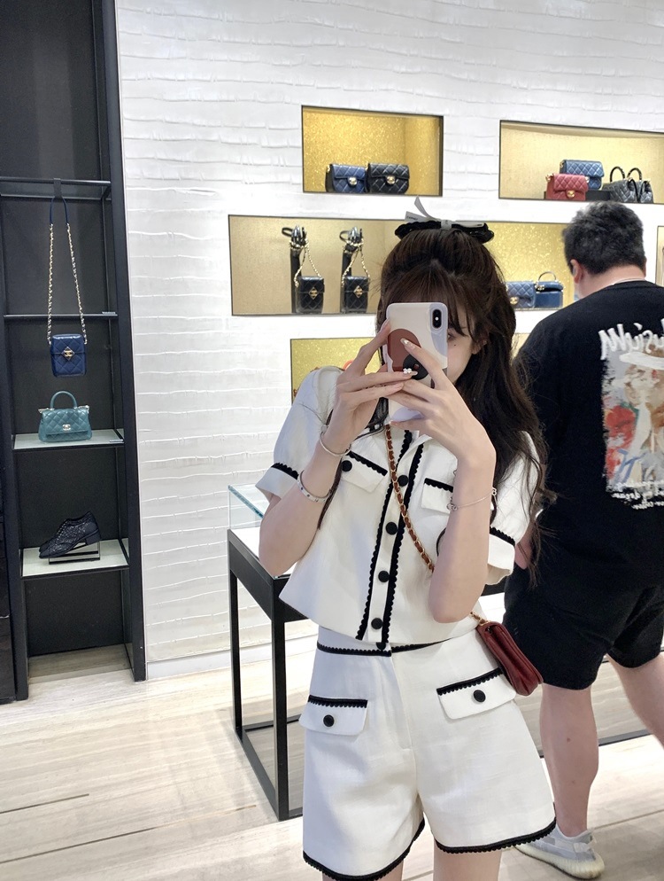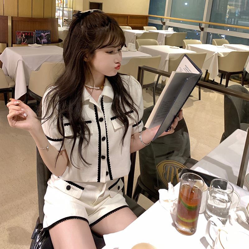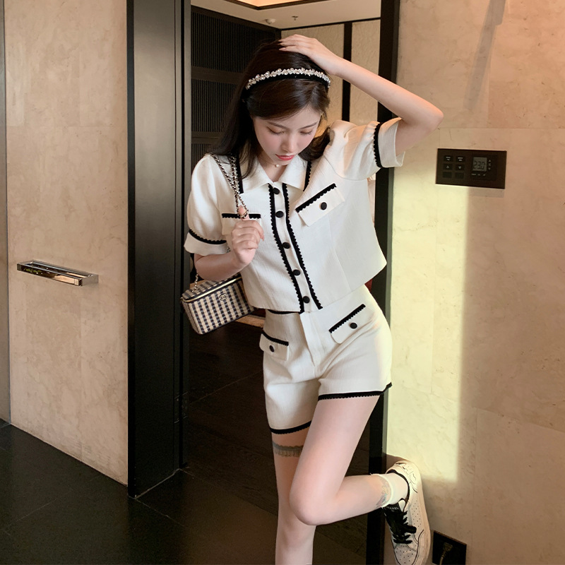 白色小香名媛风套装女夏洋气小个子辣妹风短袖开衫阔腿短裤两件套