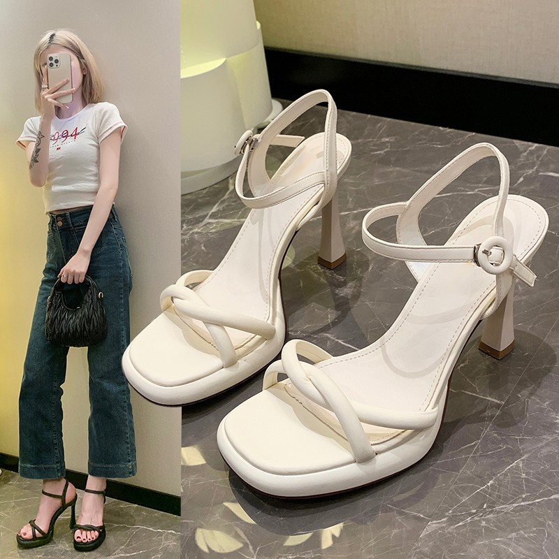 设计感绿色简约凉鞋女夏新款交叉细带露趾高跟鞋细跟一字带