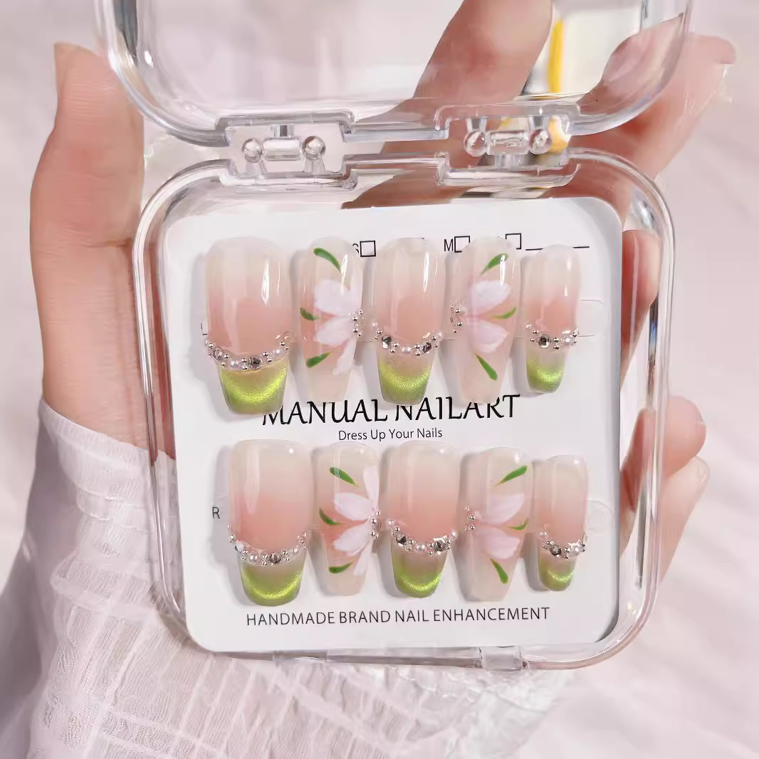 纯手工光疗穿戴甲绿精灵冰花美甲贴片成品批发法式猫眼高级感手绘