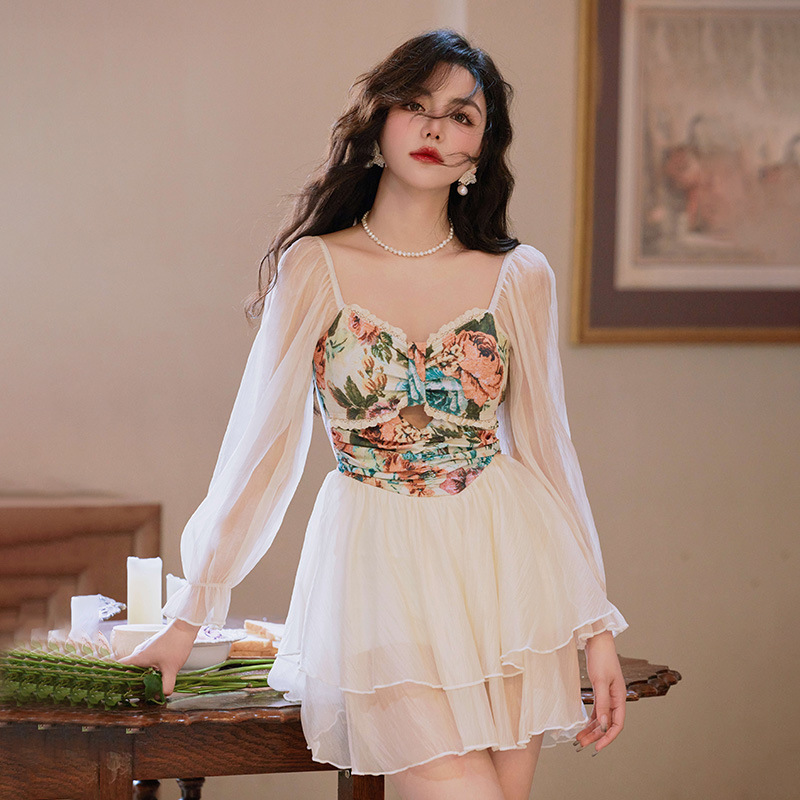 新款欧美印花泳衣长袖防晒泳衣女修身显瘦泳衣女高级感连体泳衣女
