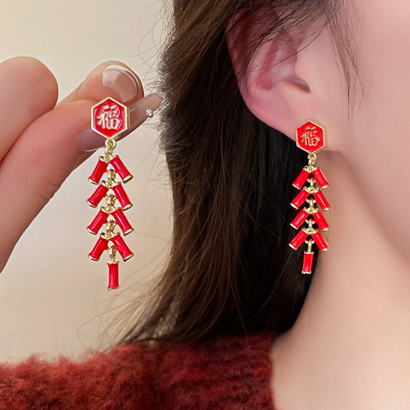 中国风新年滴油福字鞭炮流苏银针耳环过年喜庆个性创意气质耳饰女