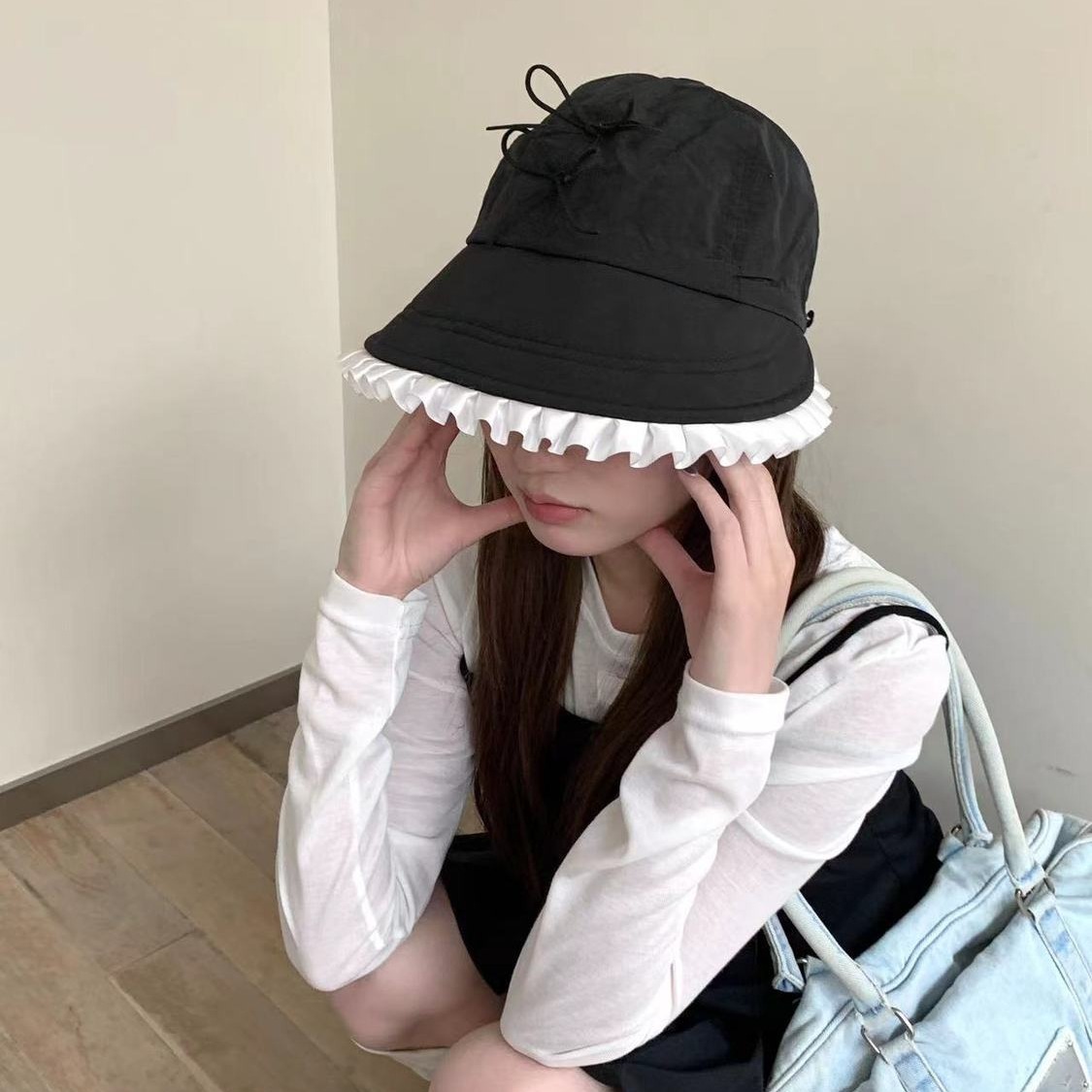 夏季韩国新款可爱韩系速蝴蝶结遮阳帽花边防晒显脸渔夫帽薄款遮阳