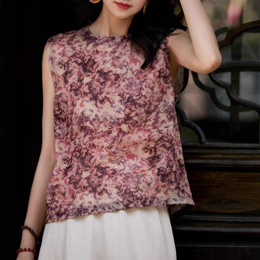 气质绝佳 夏日必备 印花圆领无袖上衣女25百搭新款小衫