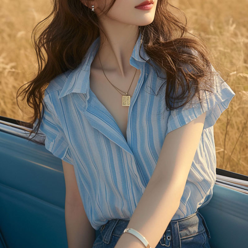 今年流行漂亮的小衫法式气质甜辣小上衣蓝色短袖条纹衬衫女夏新款