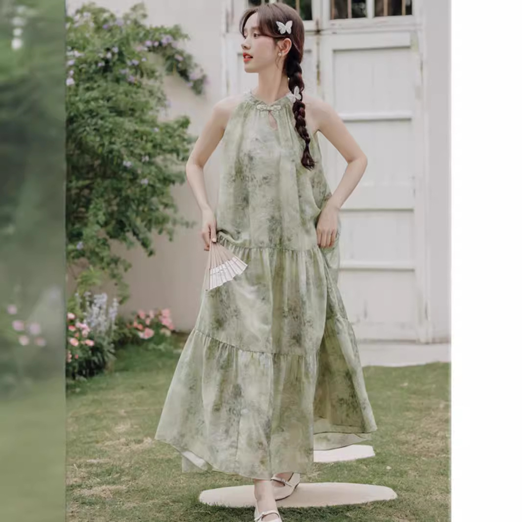 新中式国风改良旗袍连衣裙女茶歇法式挂脖碎花裙海边度假沙滩长裙