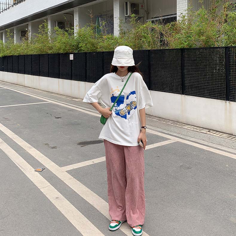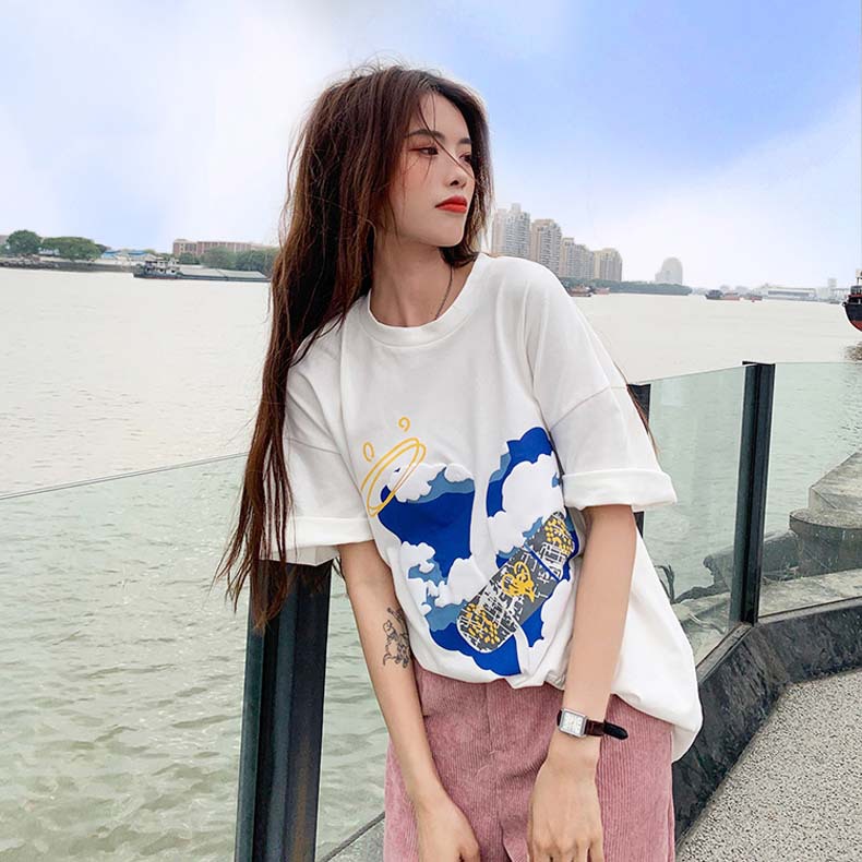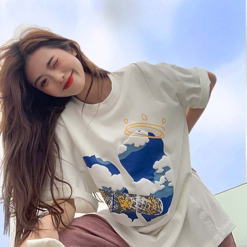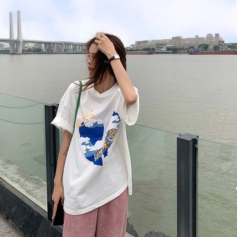 白色卡通印花短袖T恤女夏季新款ins时尚设计感宽松中长款体恤