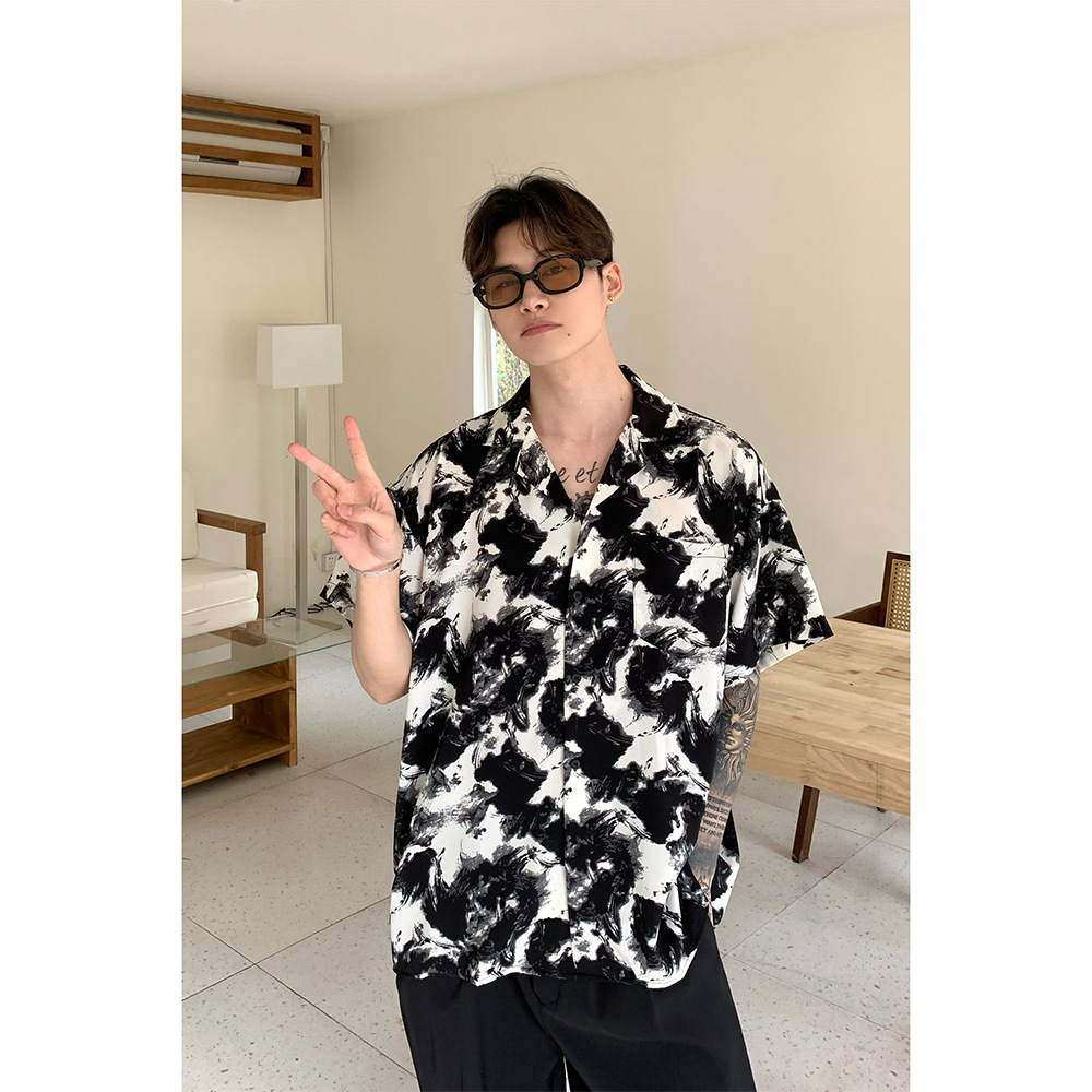 小众扎染撞色翻领衬衫男夏季新款宽松痞帅短袖垂感免烫花衬衣