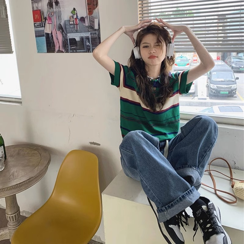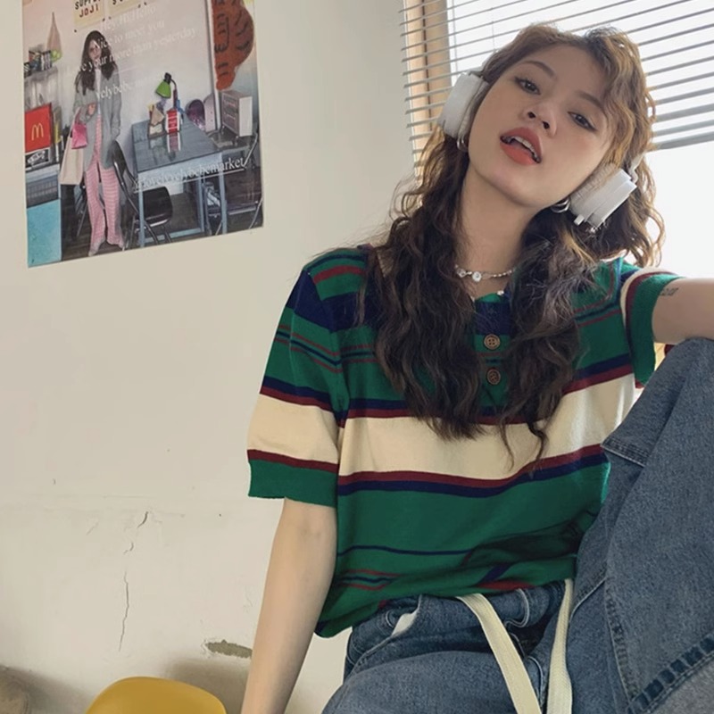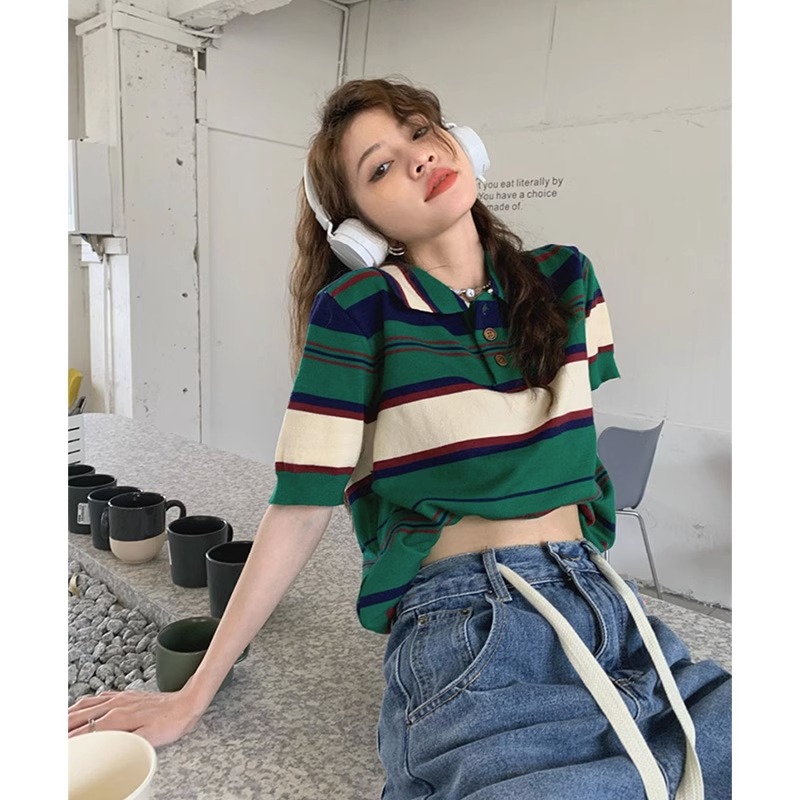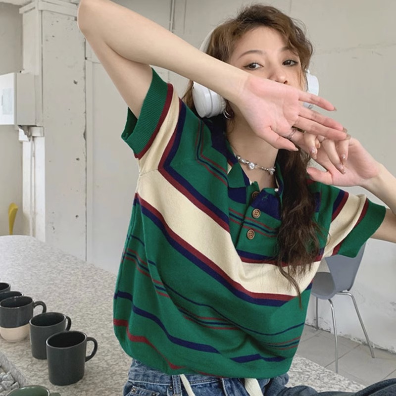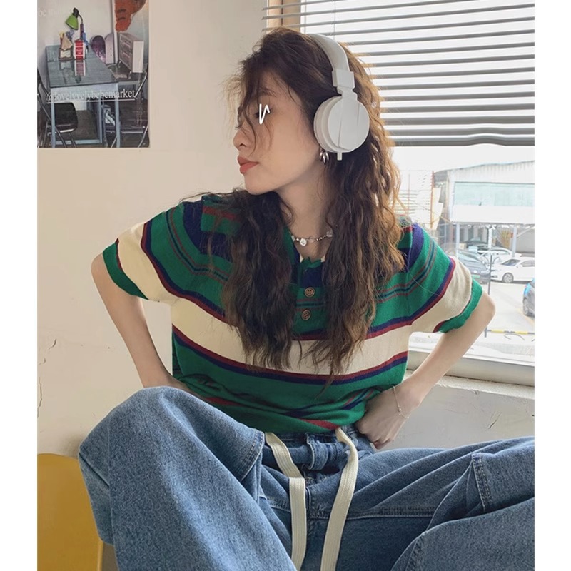 绿色polo领条纹t恤女短袖夏季设计感小众宽松百搭洋气上衣