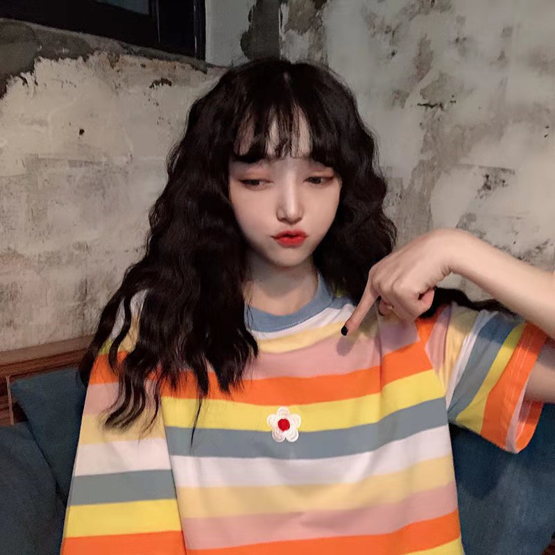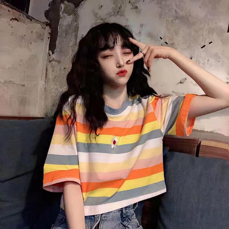 夏季新款泫雅风彩虹条纹露脐上衣宽松短款圆领短袖t恤女ins潮