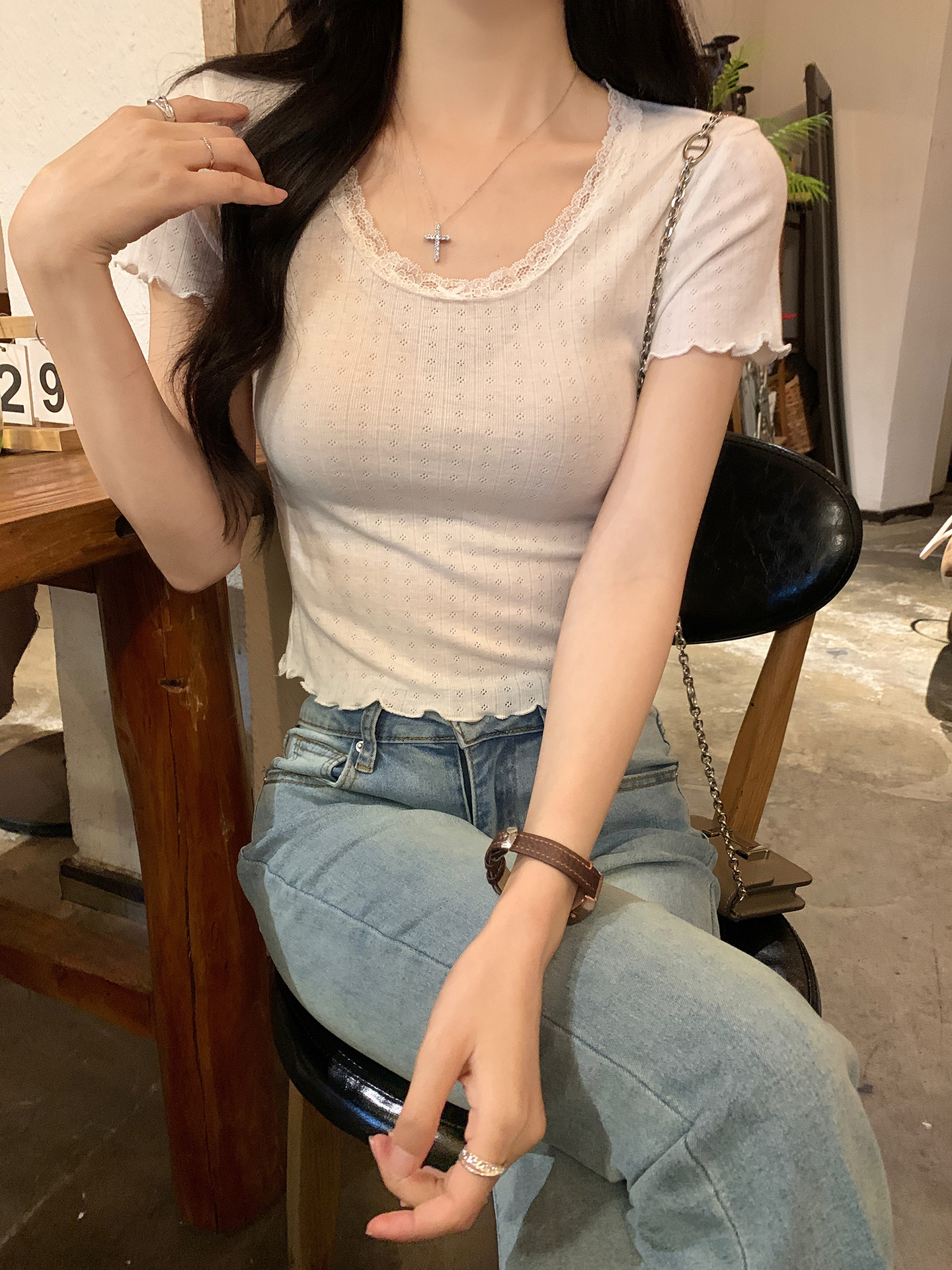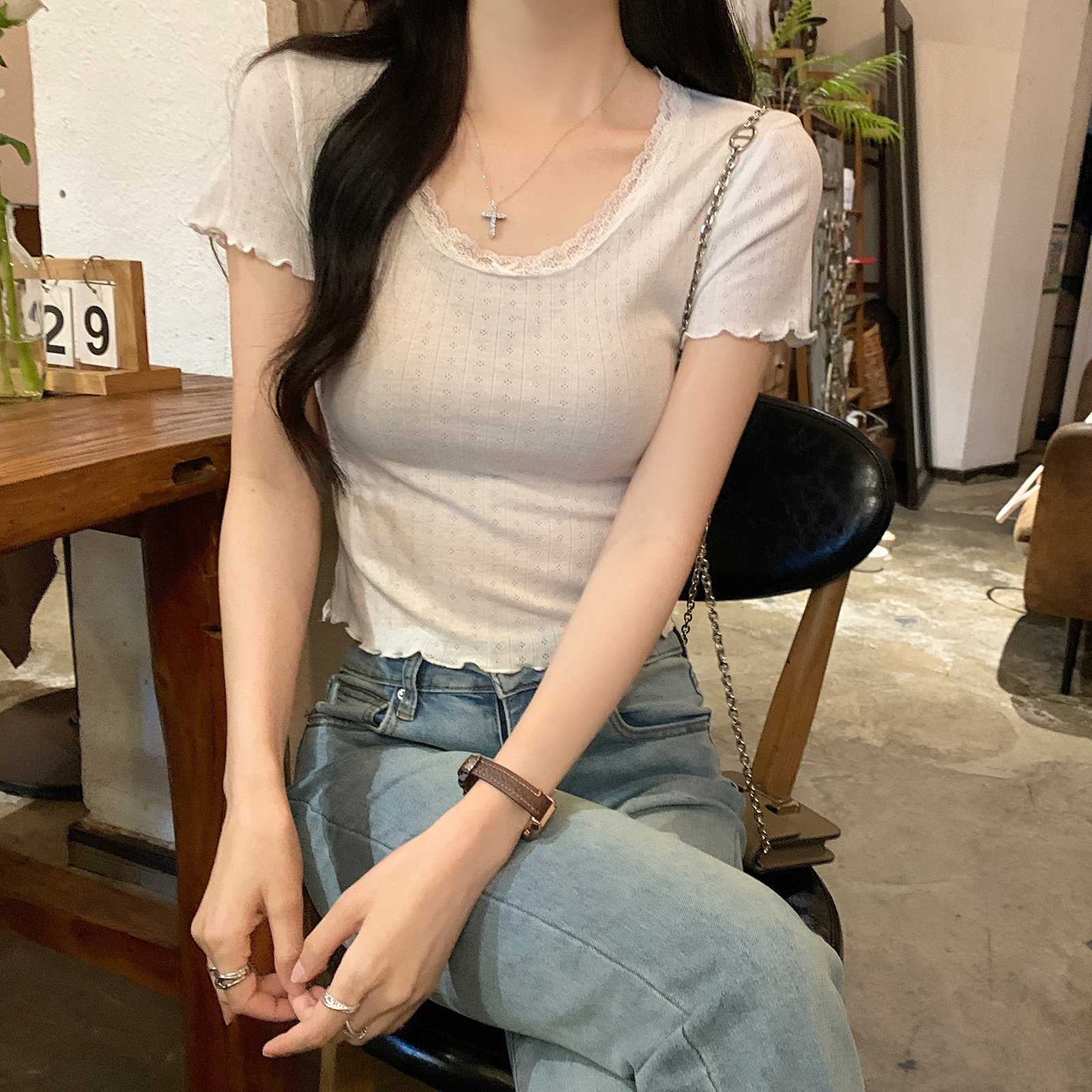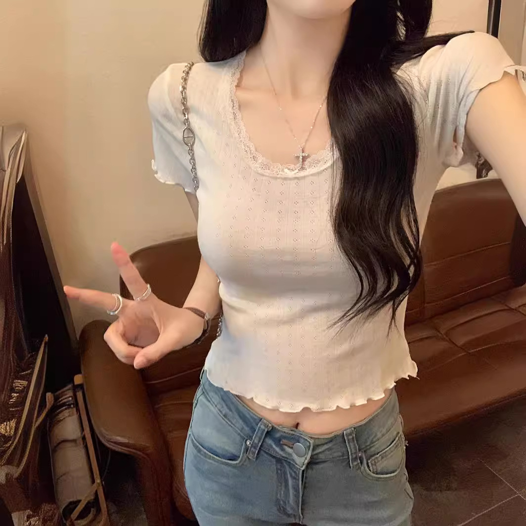 白色纯欲甜美蕾丝修身显瘦打底女夏季正肩短款内搭短袖T恤上衣ins
