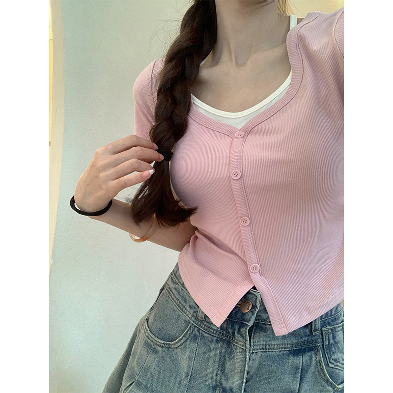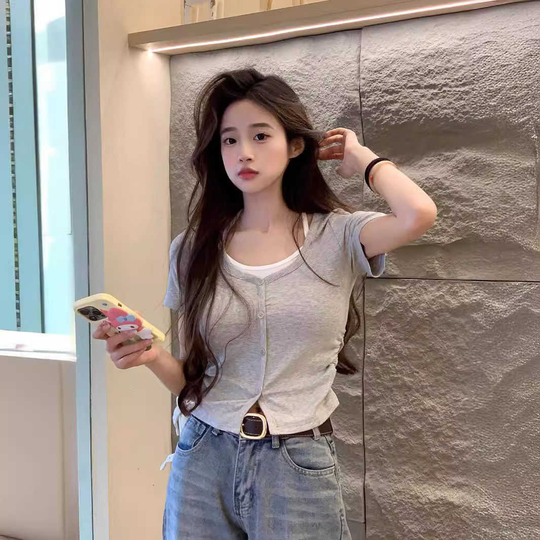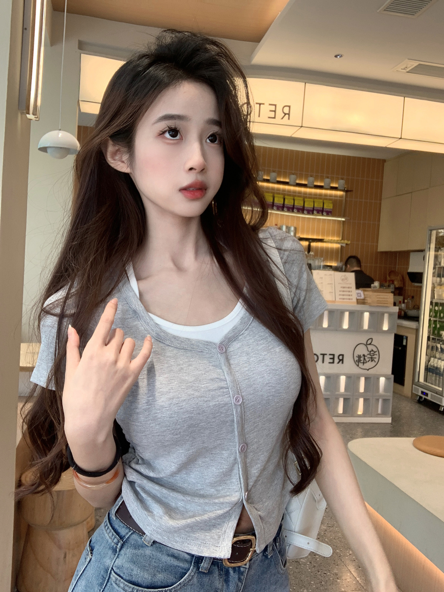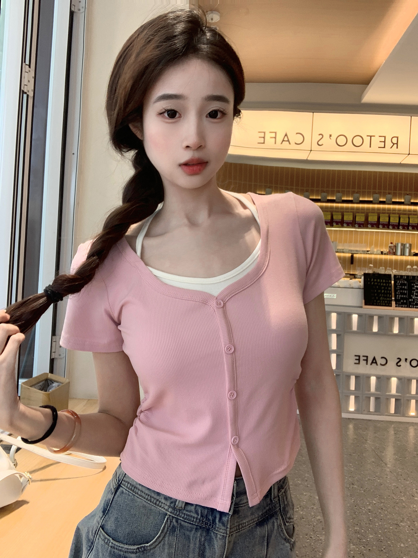 辣妹设计感假两件挂脖短袖T恤女装夏季修身显瘦短款休闲上衣