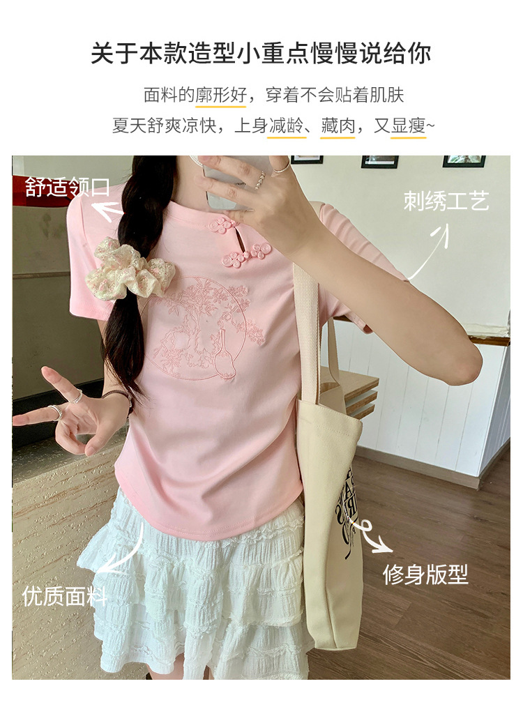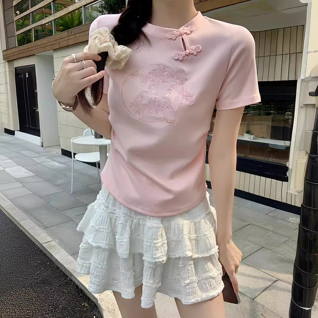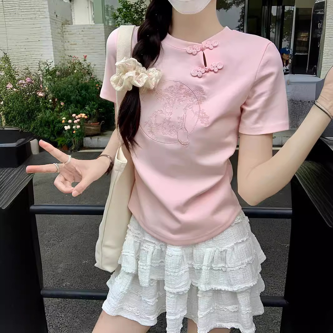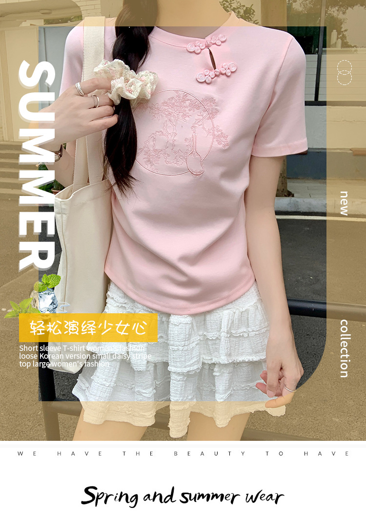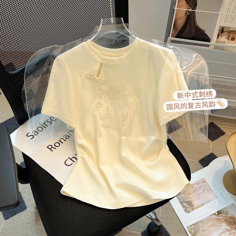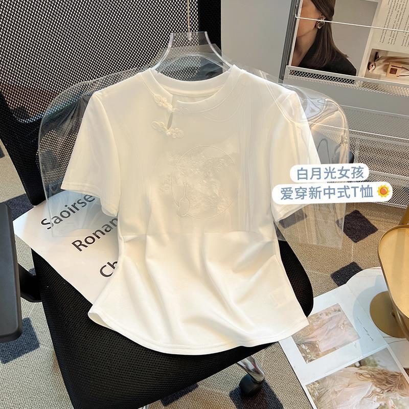 新中式国风设计感正肩短袖t恤衣女装夏潮盘扣高级感修身短款上衣