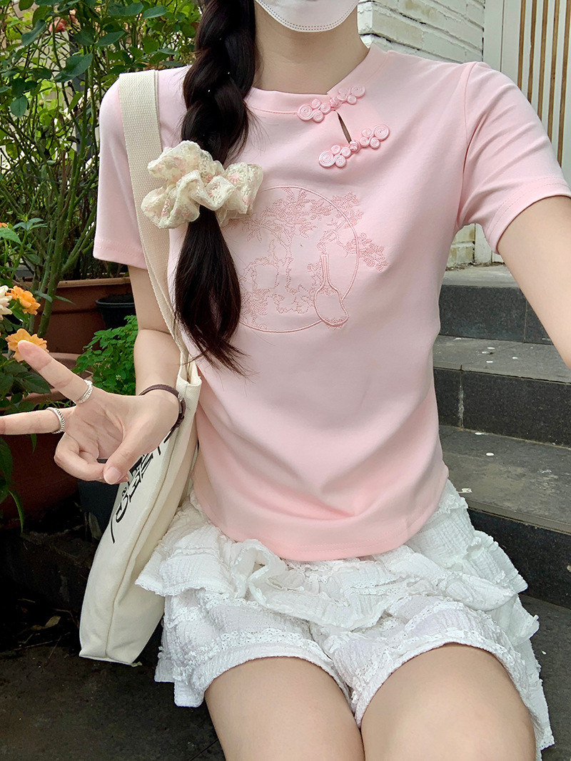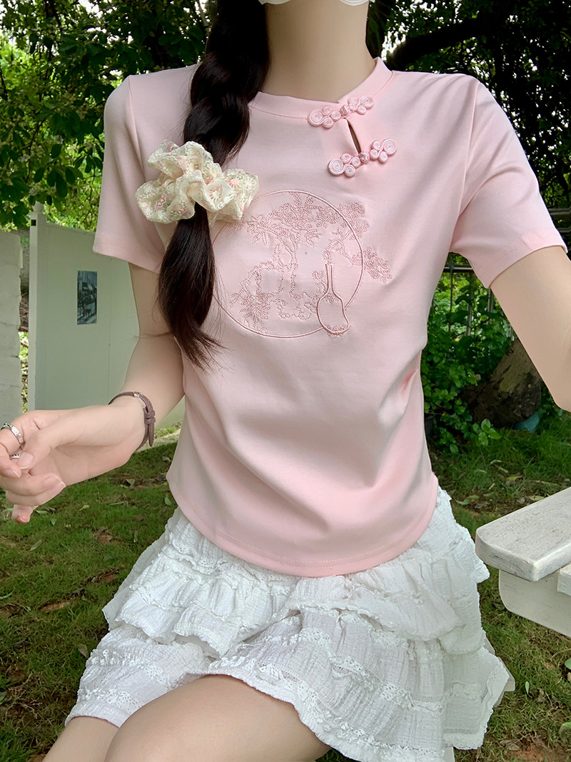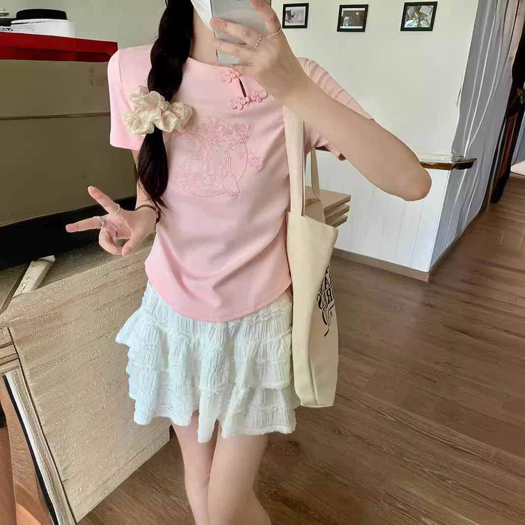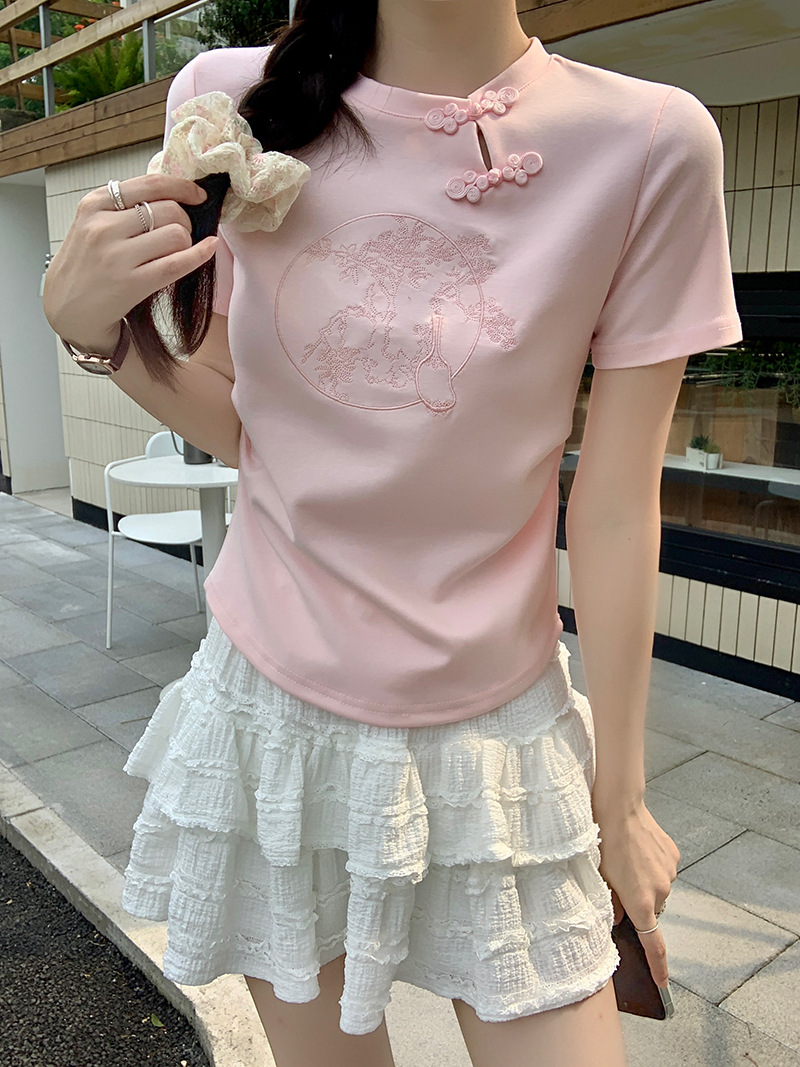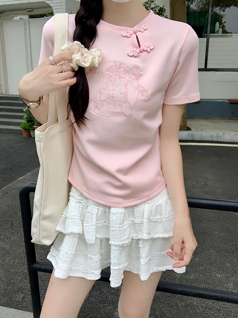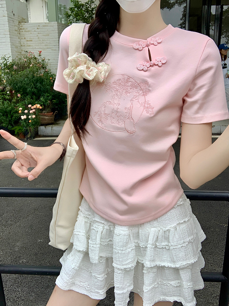 新中式国风设计感正肩短袖t恤衣女装夏潮盘扣高级感修身短款上衣