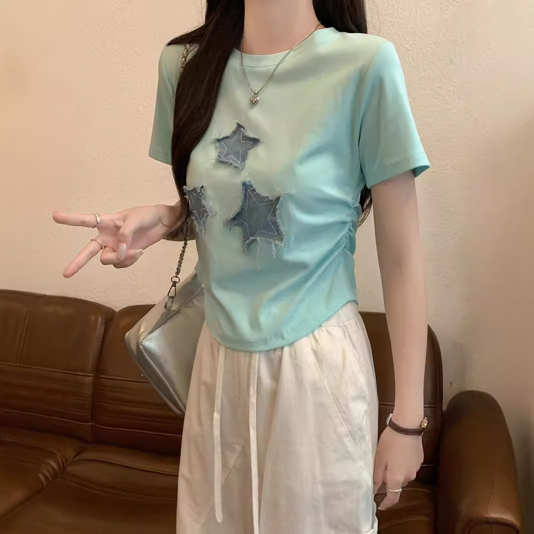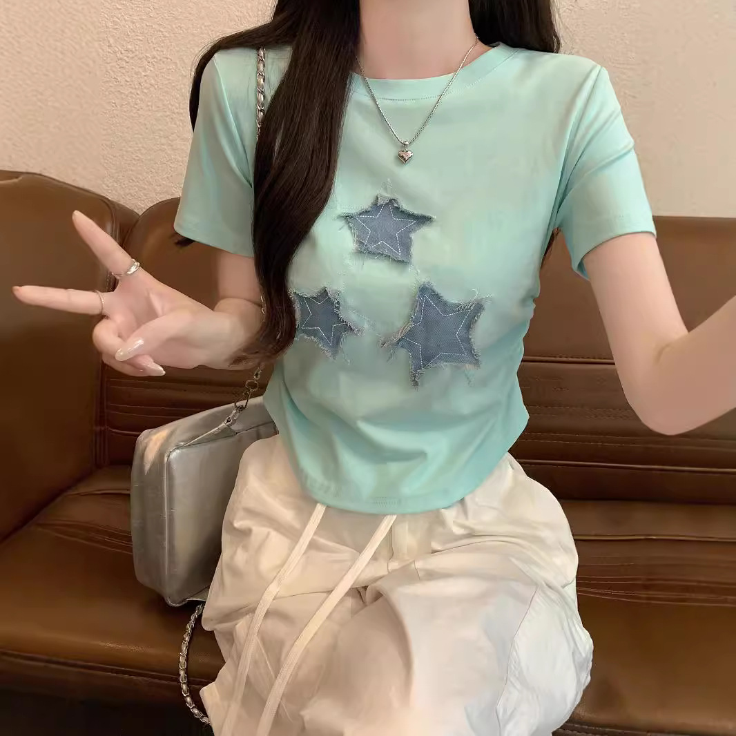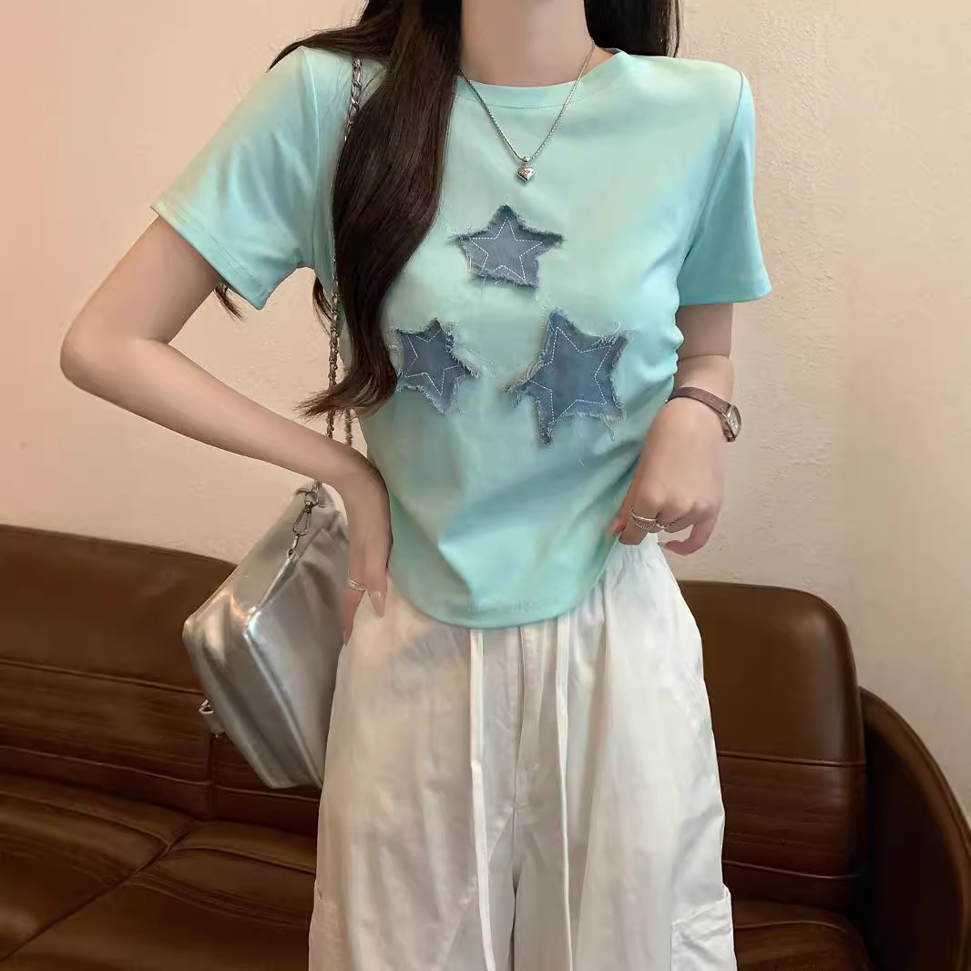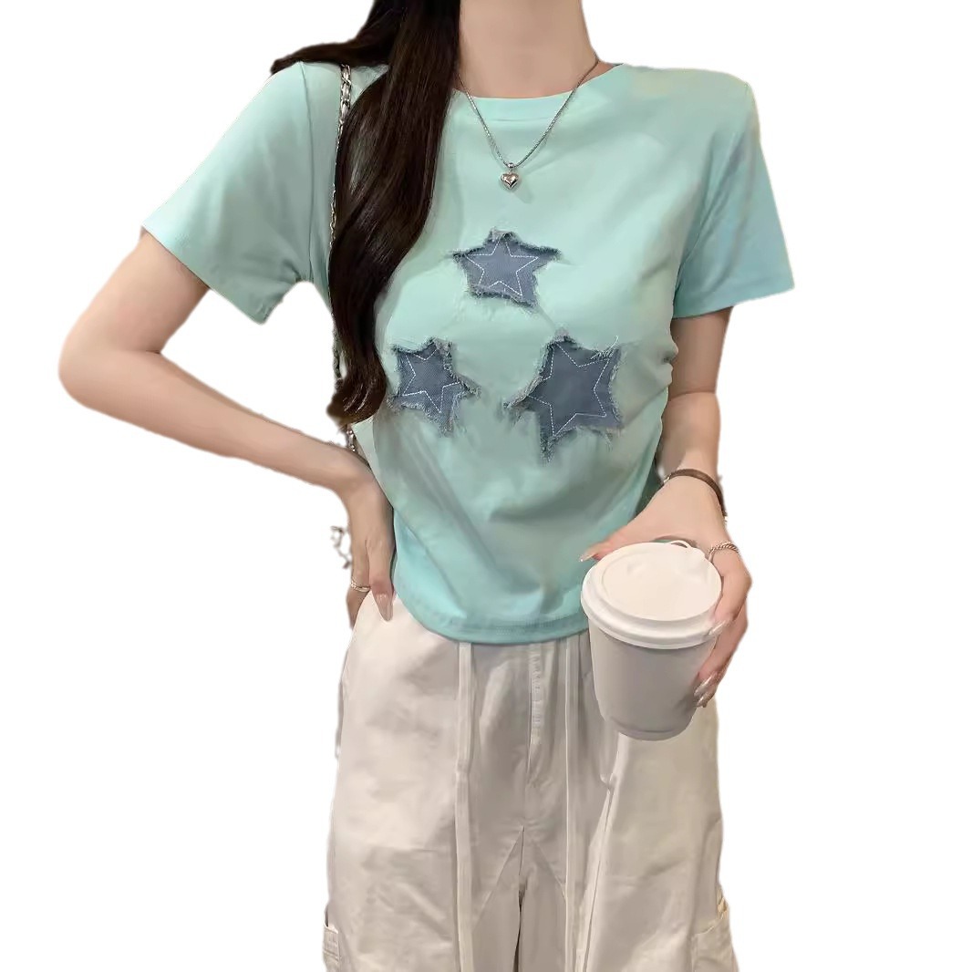 法式蓝色星星正肩小众T恤短袖紧身短款夏日辣妹甜辣上衣女多巴胺