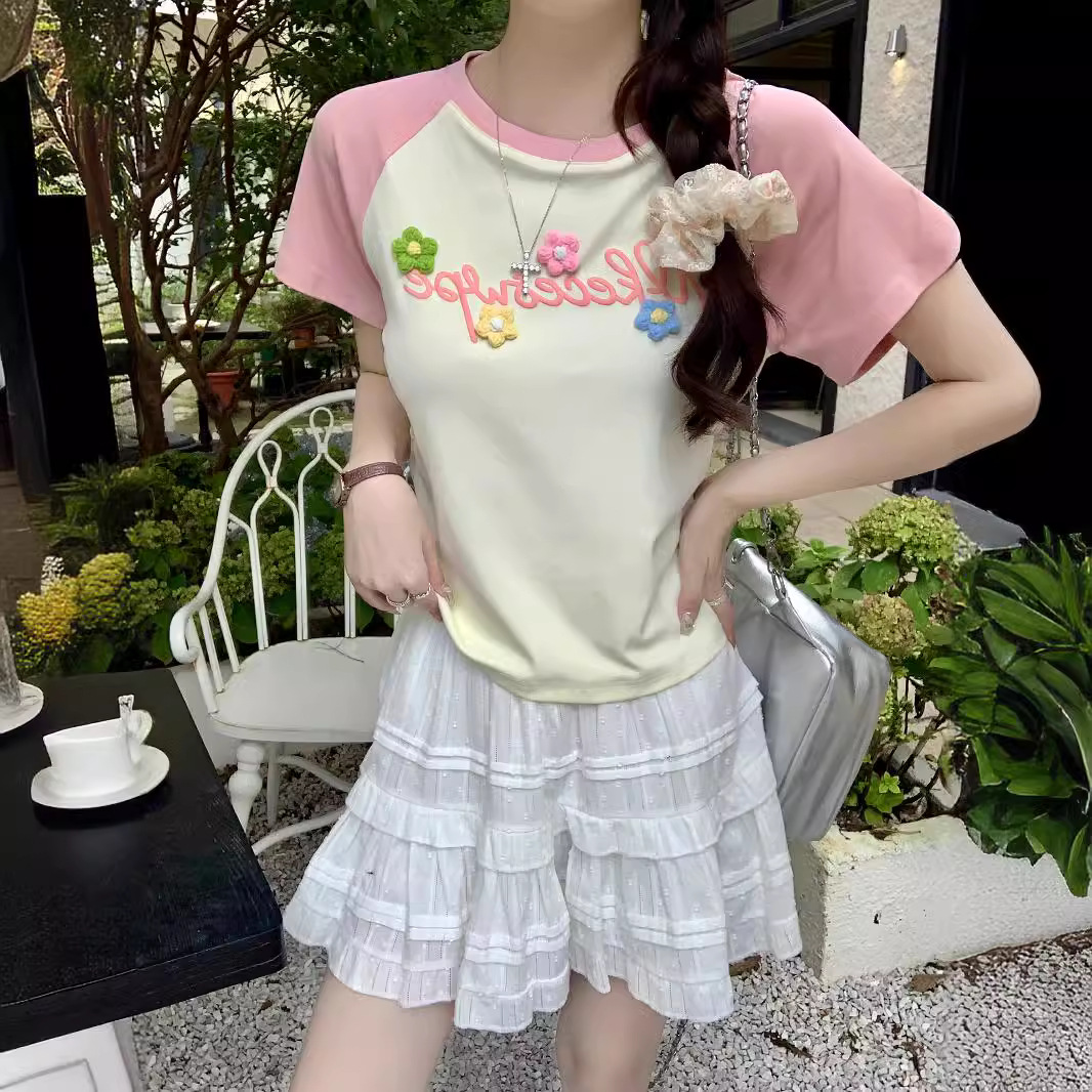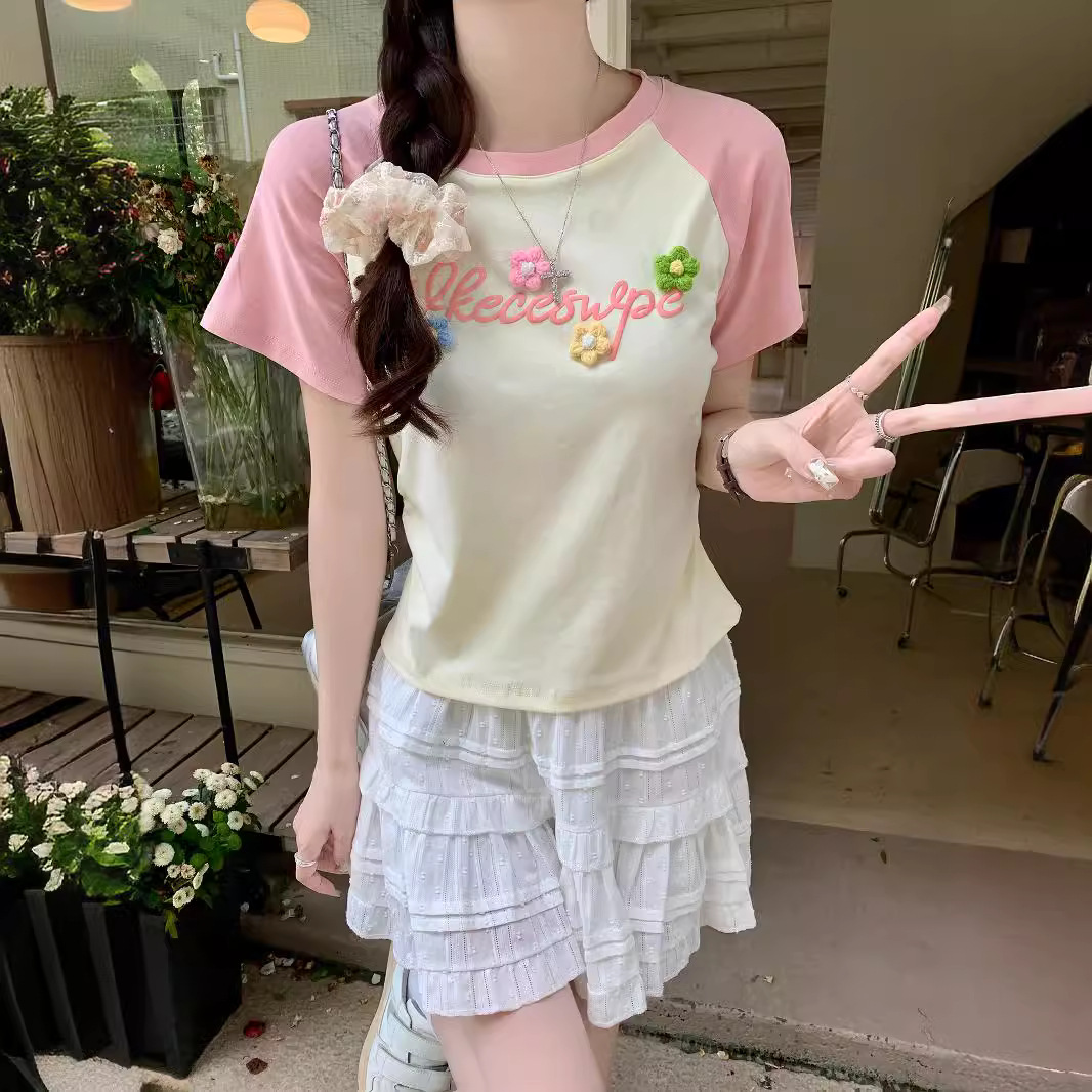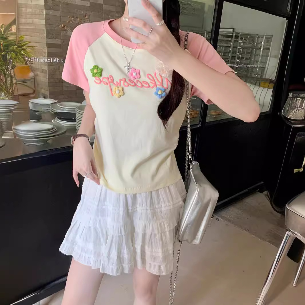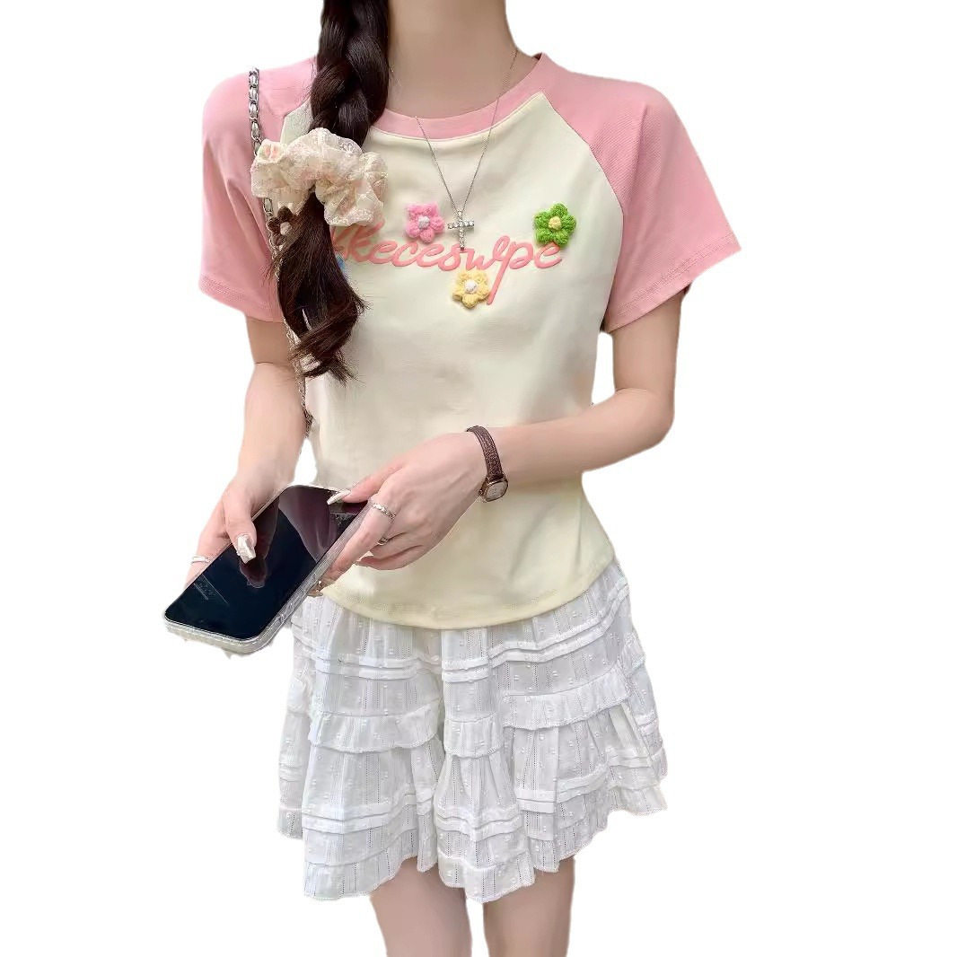 立体小花撞色正肩短袖T恤女夏季修身收腰甜酷小众设计感短款上衣