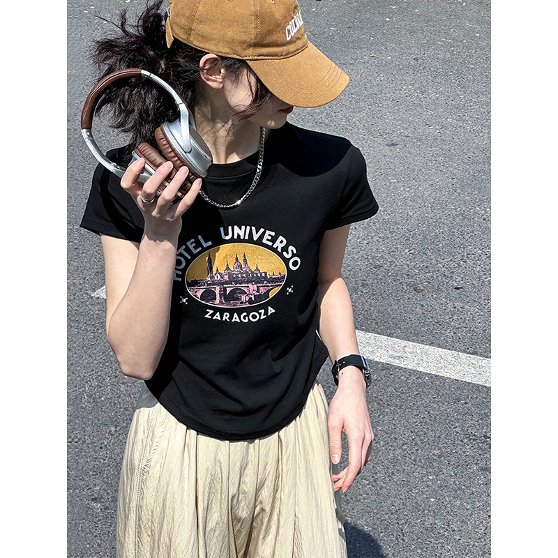 夏季新款T恤上衣女韩系圆领收腰复古小众印花短袖