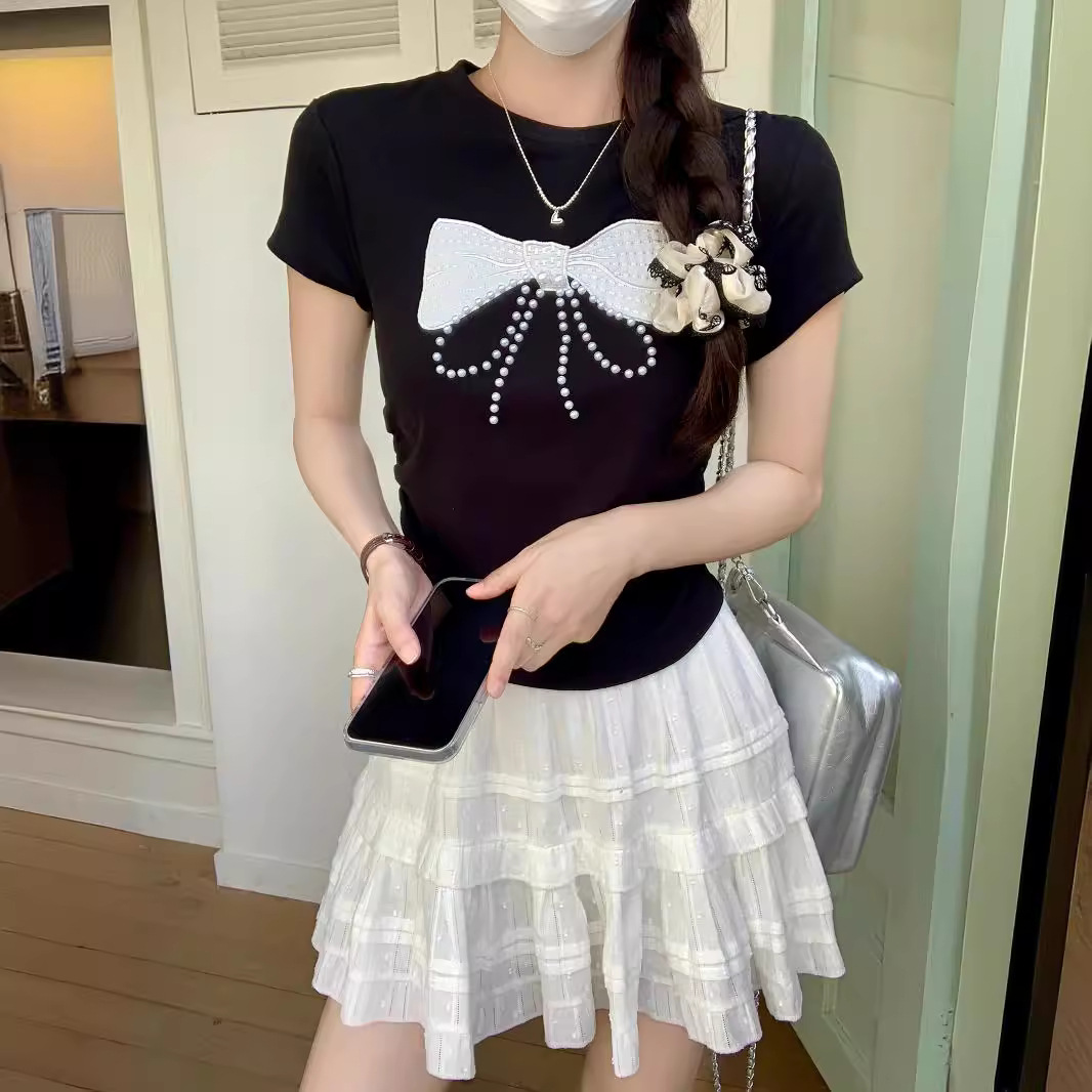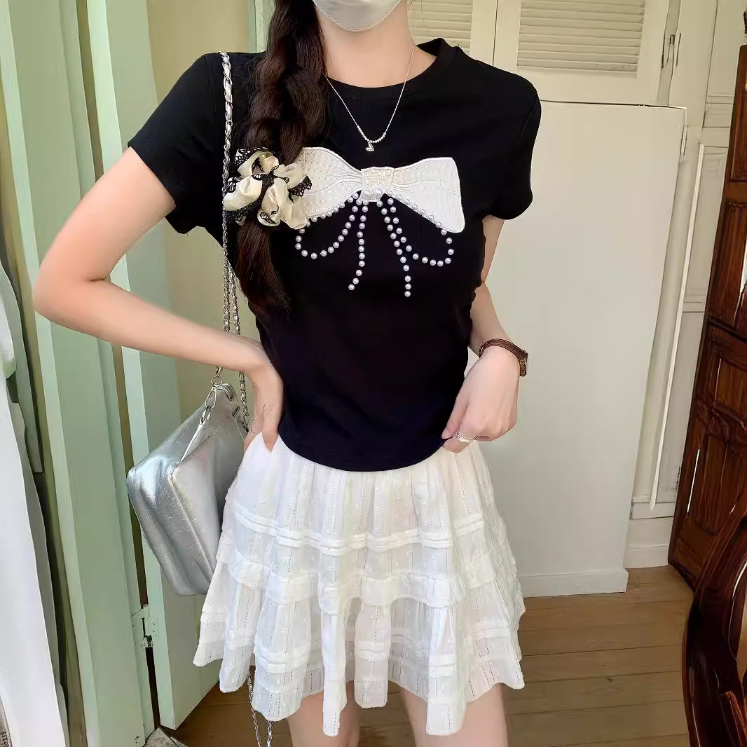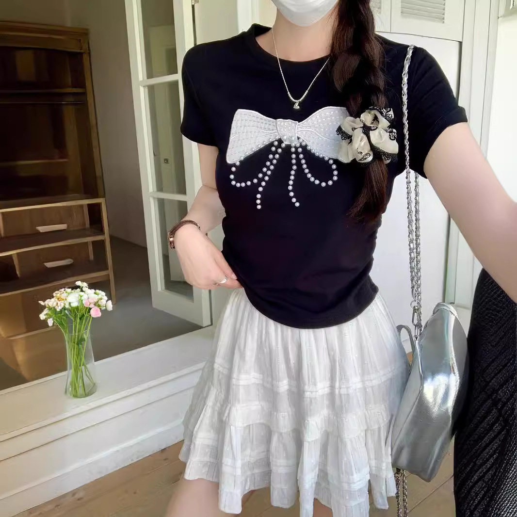 黑色蝴蝶结钉珠短款短袖T恤女装夏季新款设计感正肩修身显瘦上衣