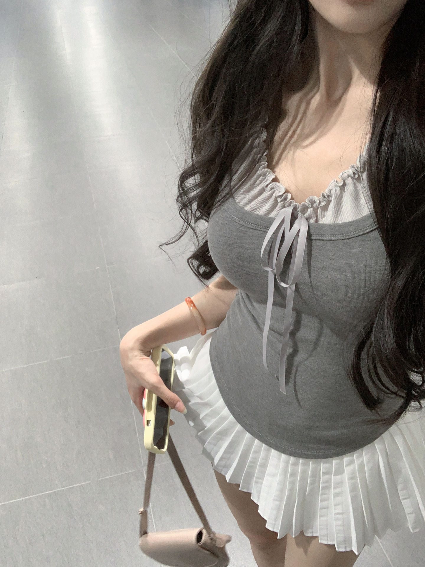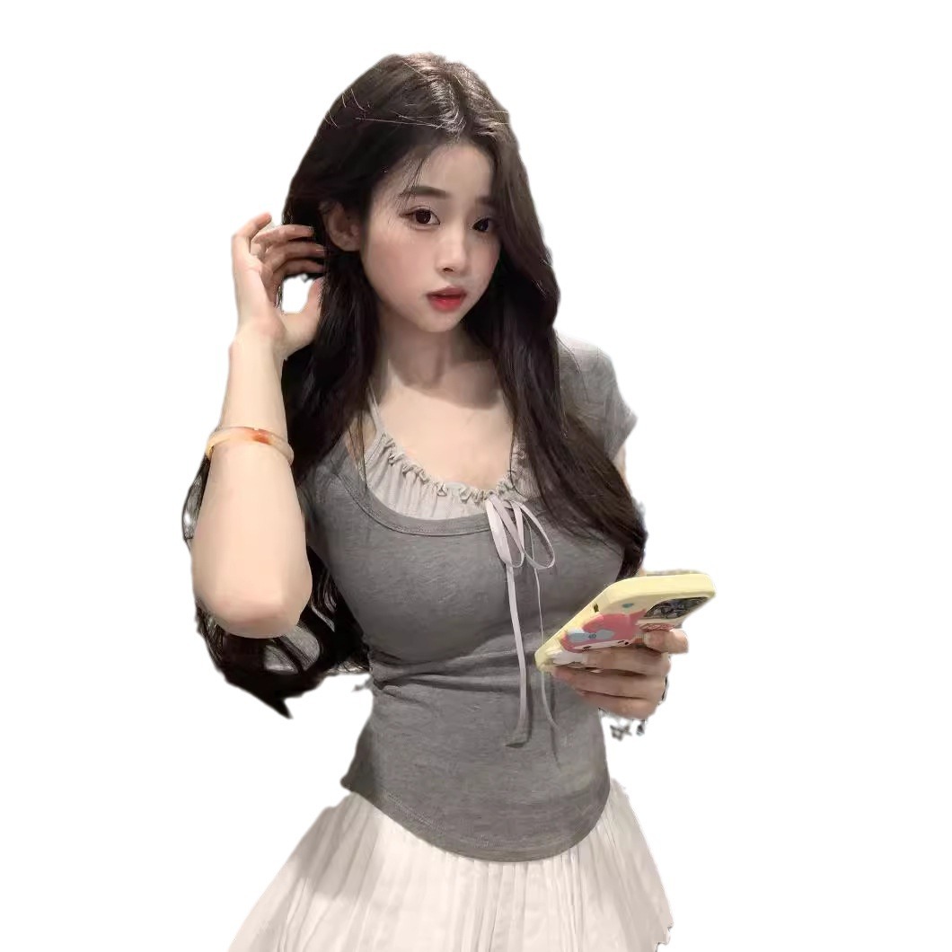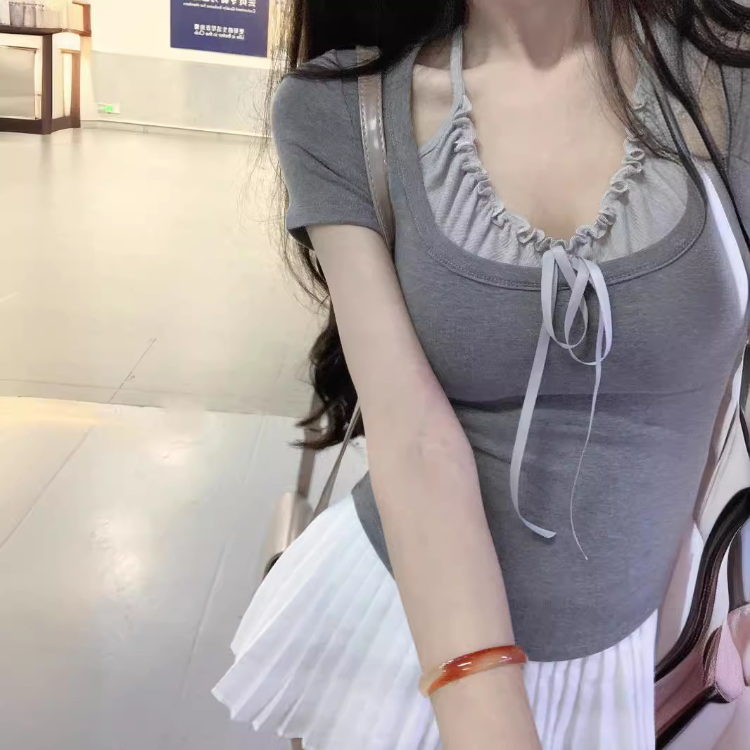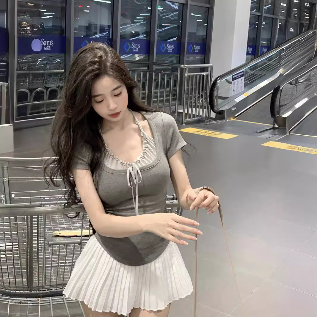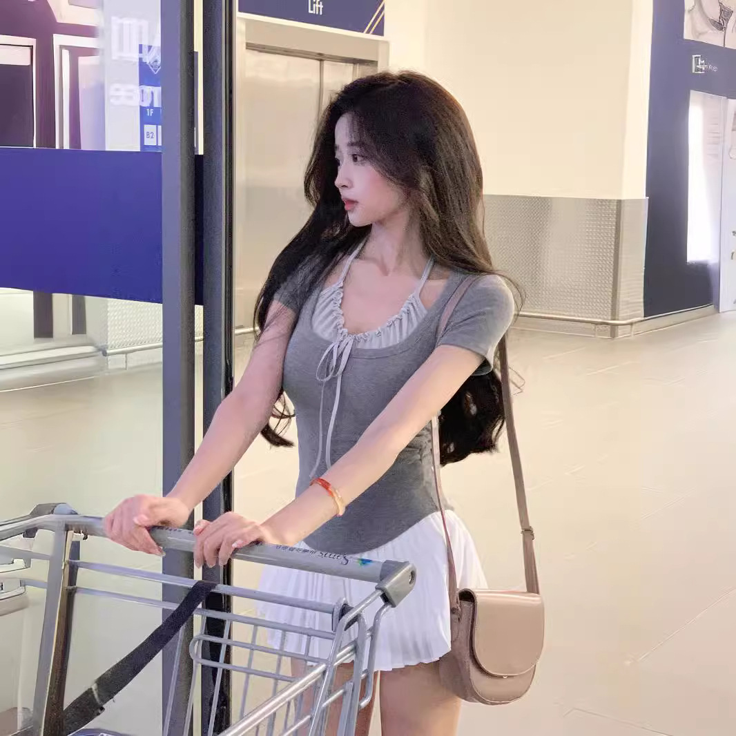 辣妹修身假两件木耳边拼接挂脖正肩T恤女夏季设计感短袖褶皱上衣