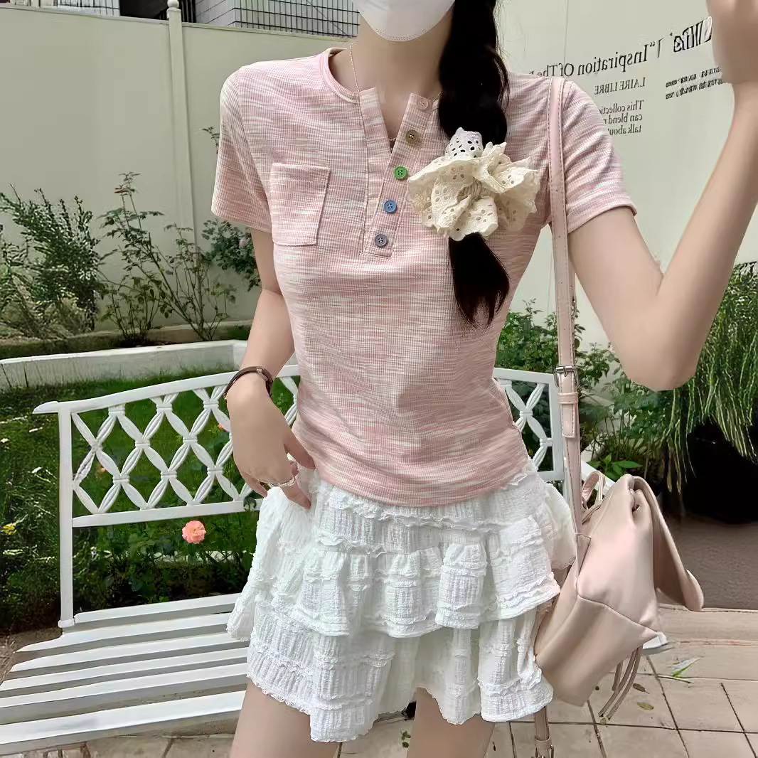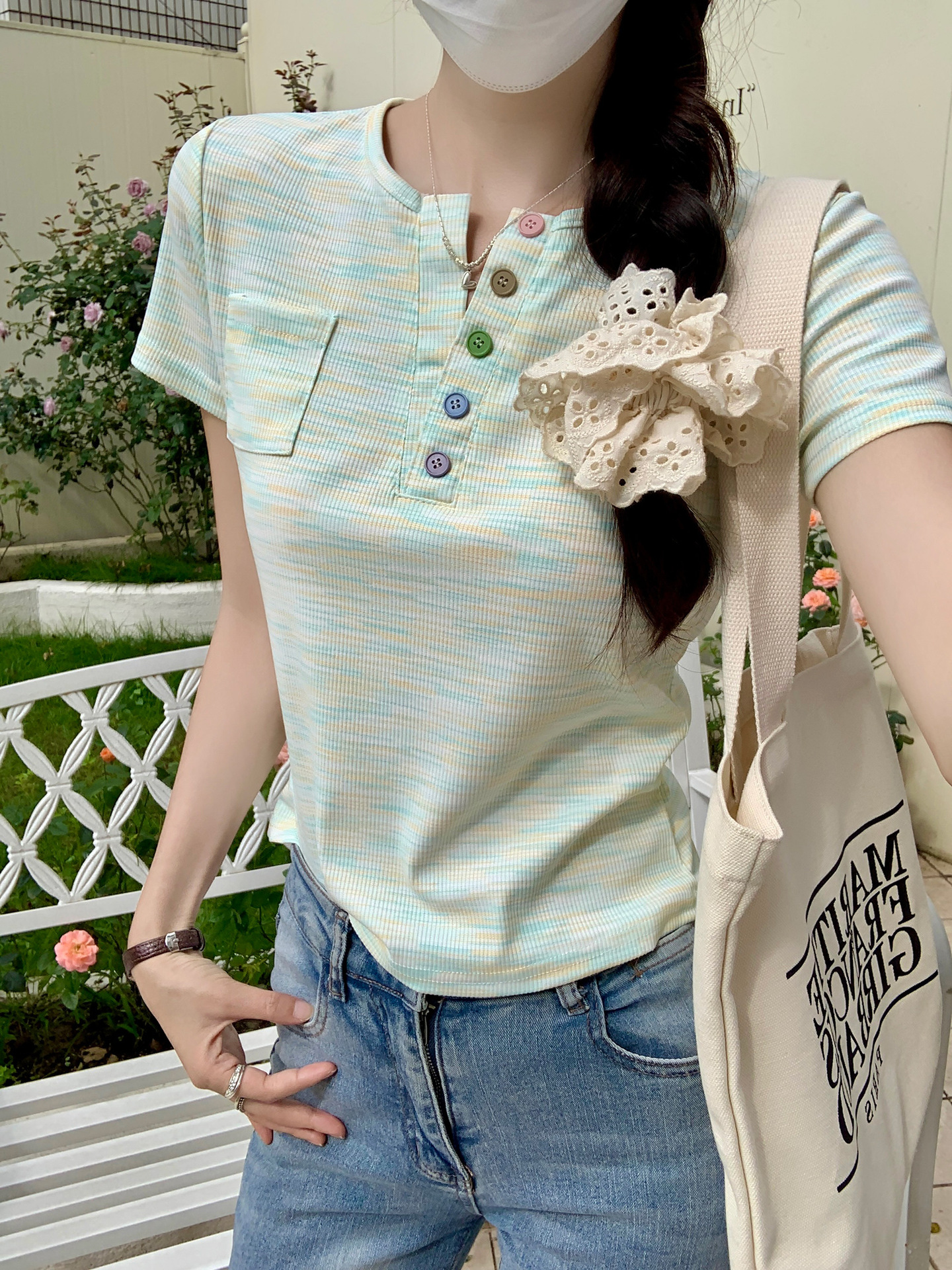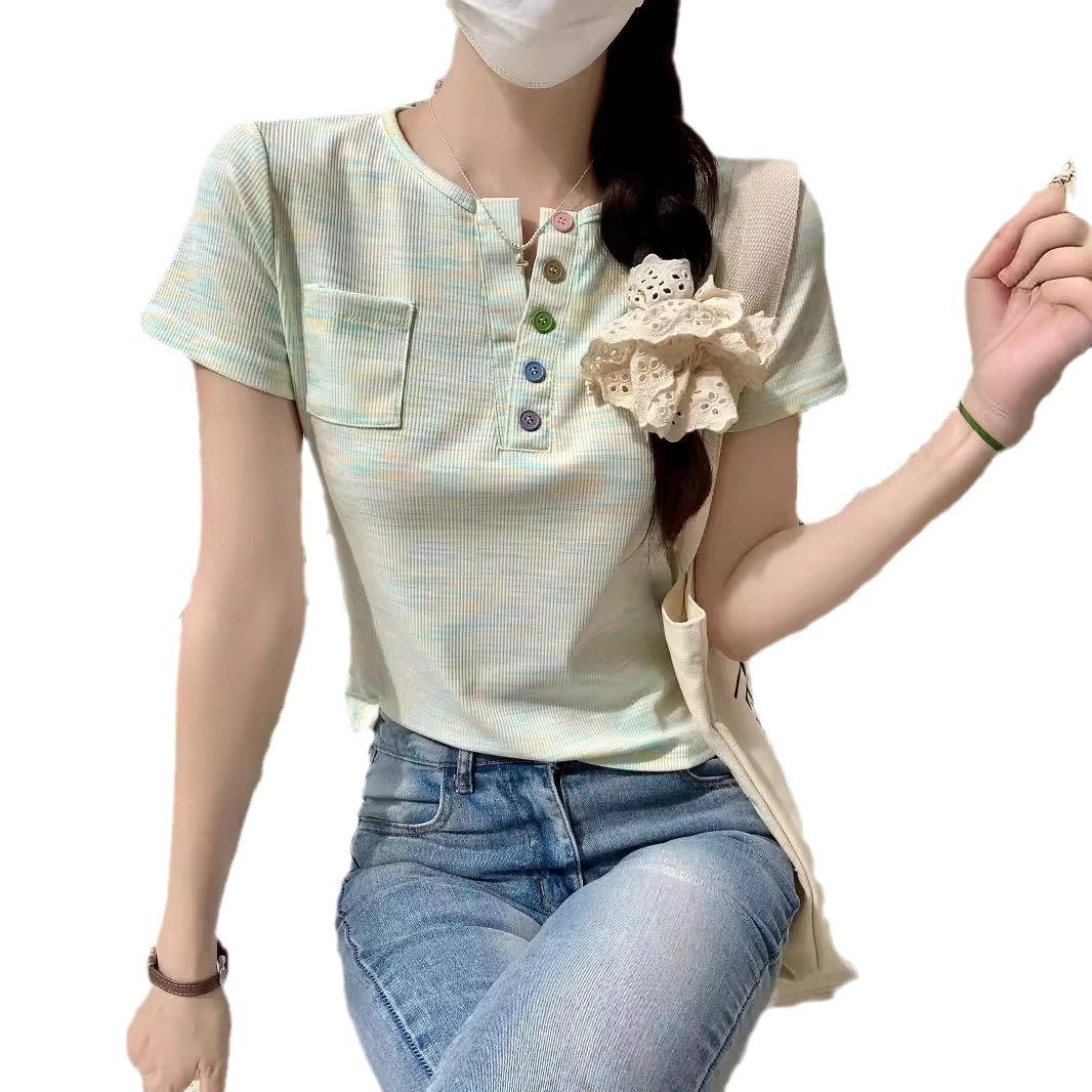 薄荷绿渐变纽扣v领正肩短袖t恤衫女装夏季打底衫单穿修身显瘦上衣