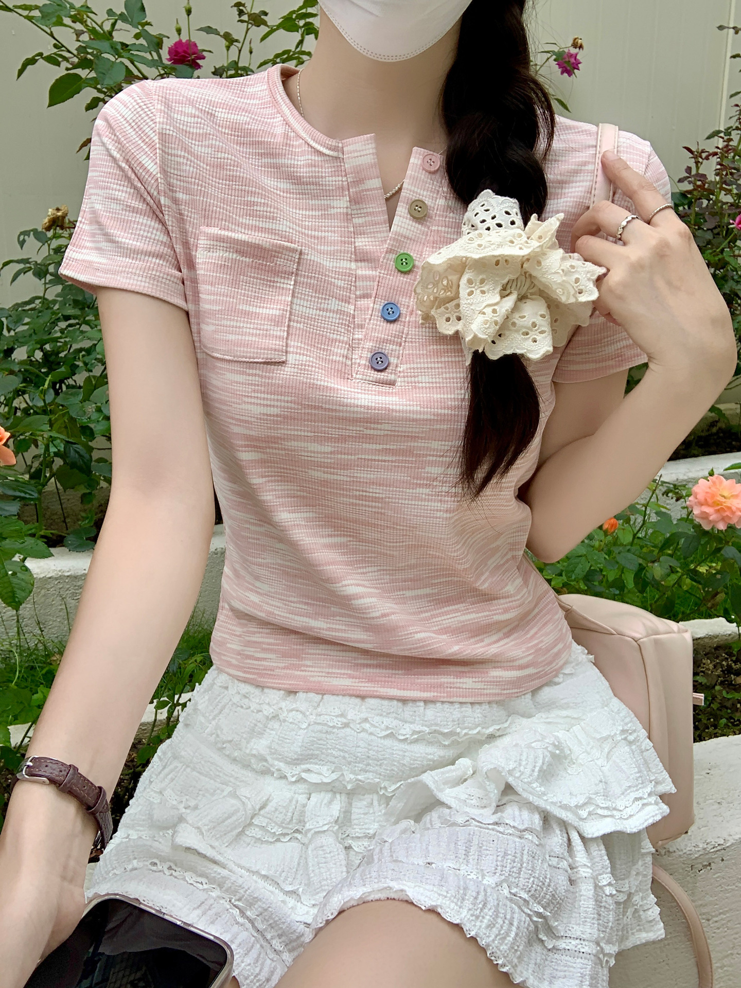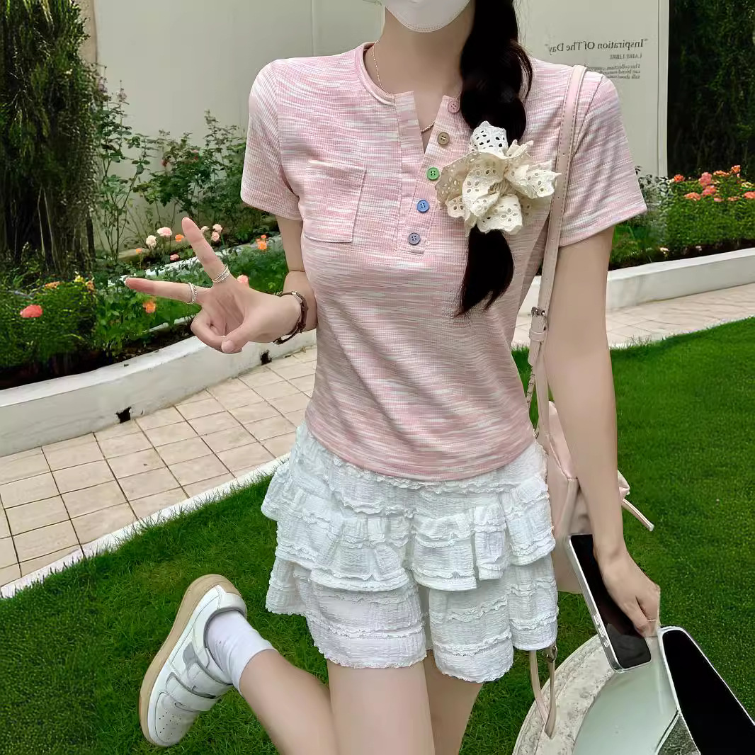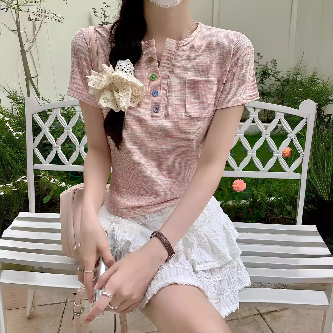 薄荷绿渐变纽扣v领正肩短袖t恤衫女装夏季打底衫单穿修身显瘦上衣