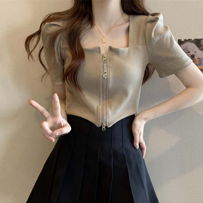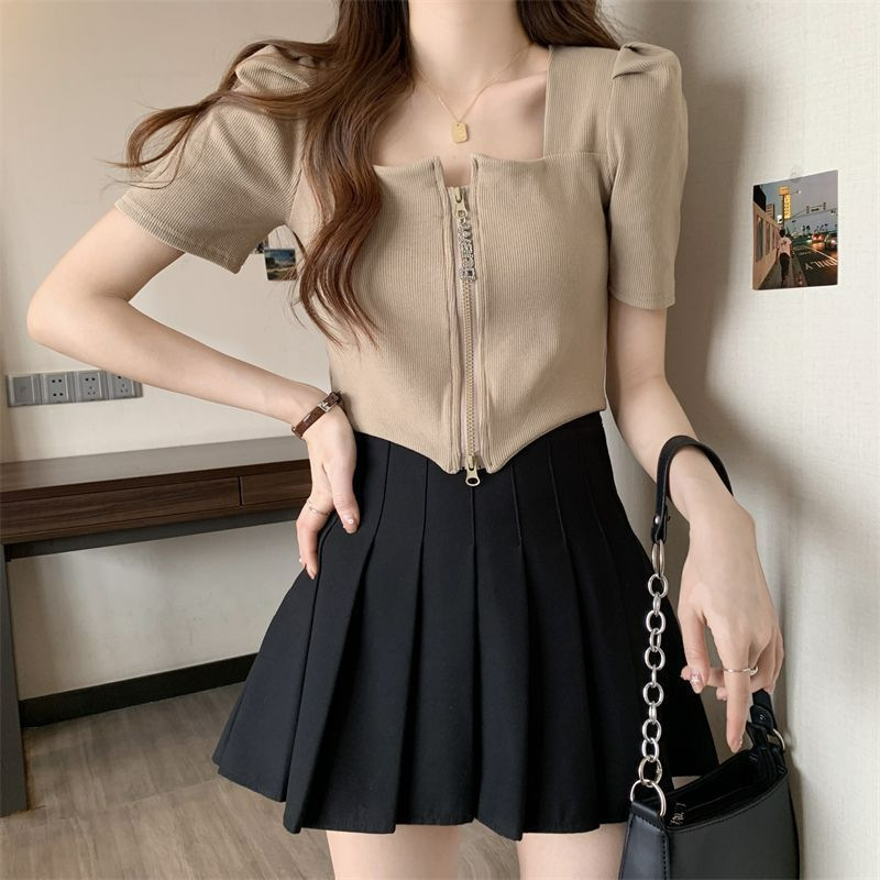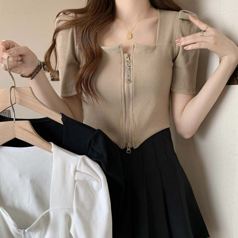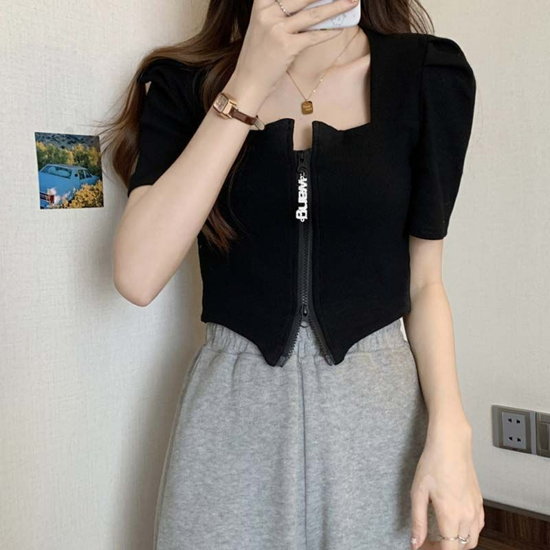 大码女装短袖正肩短袖t恤夏季胖mm显瘦短款设计感拉链方领上衣ins