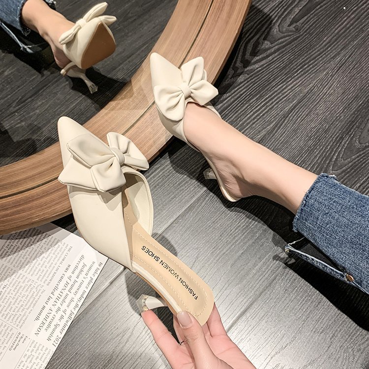 春夏新款韩版高跟鞋女细跟尖头包头拖鞋蝴蝶结时尚女鞋