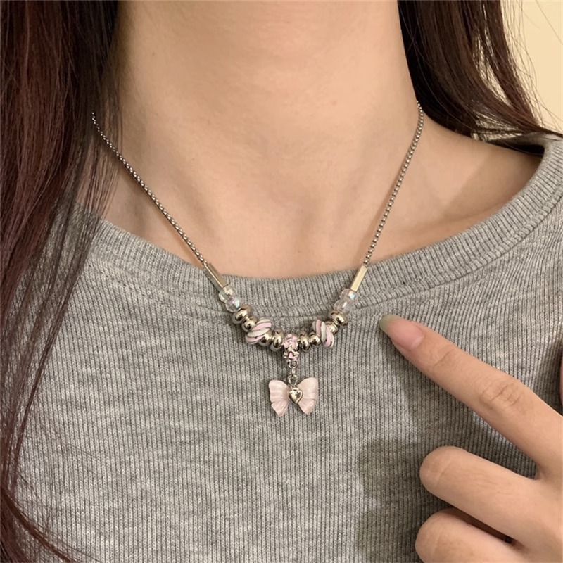 粉色蝴蝶结串珠项链女轻奢小众设计高级感锁骨链甜酷气质百搭颈链