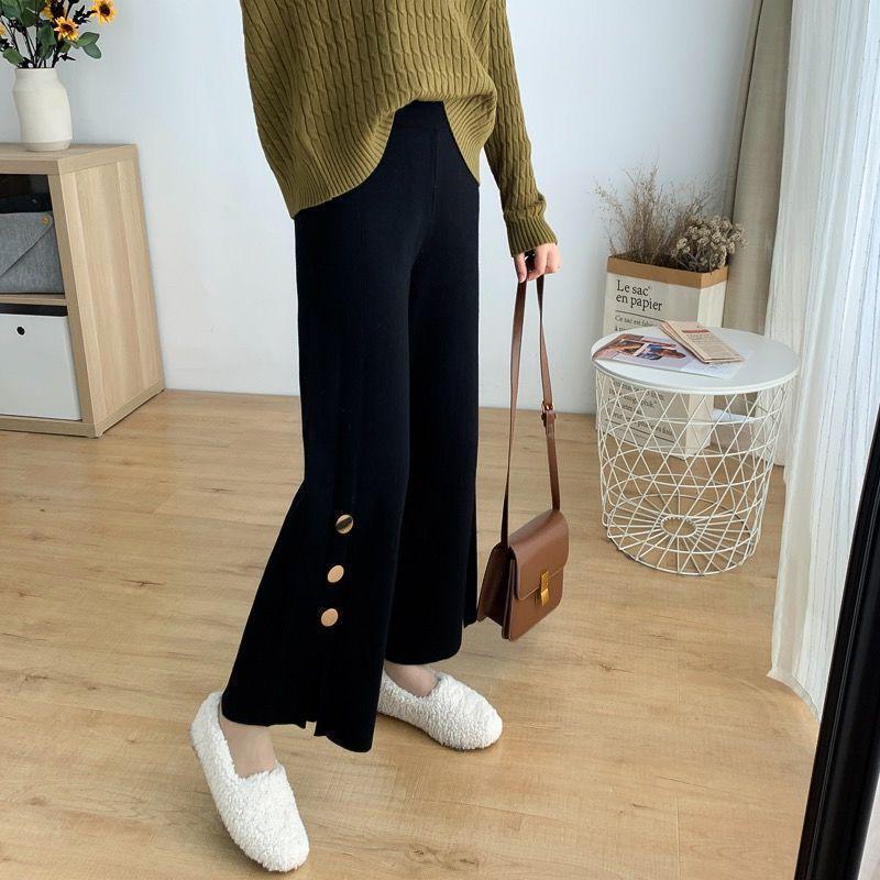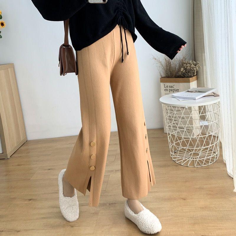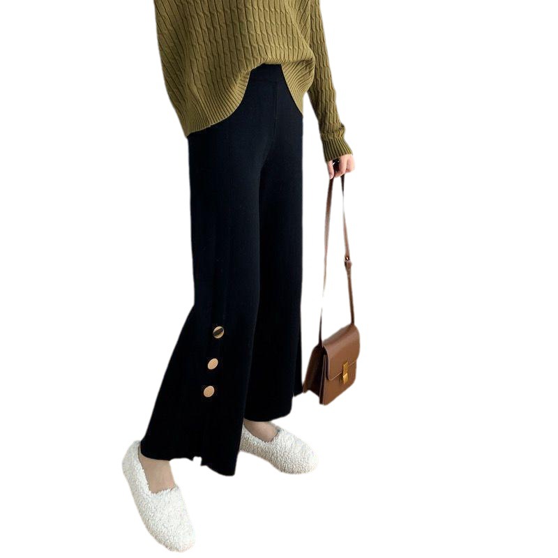 年秋季高腰垂感喇叭裤新款裤子女宽松显瘦开叉纽扣针织阔腿裤