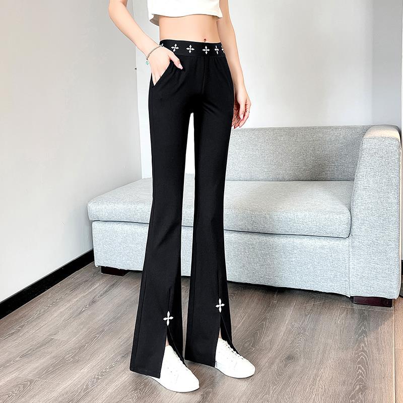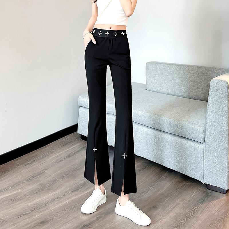 微喇叭裤女春夏新款时尚洋气高腰显瘦黑色垂感开叉休闲九分裤