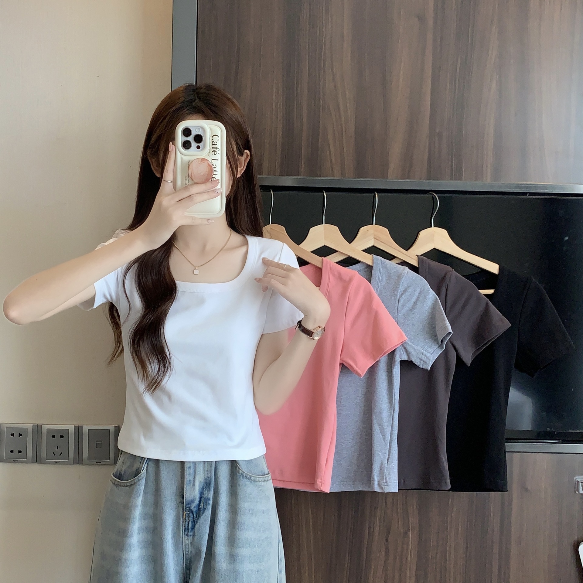 欧洲站方领短袖t恤女夏装新款正肩露锁骨修身短款小上衣