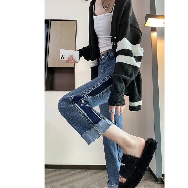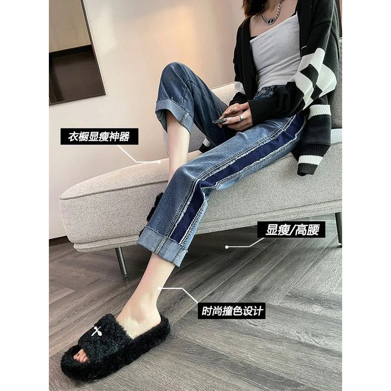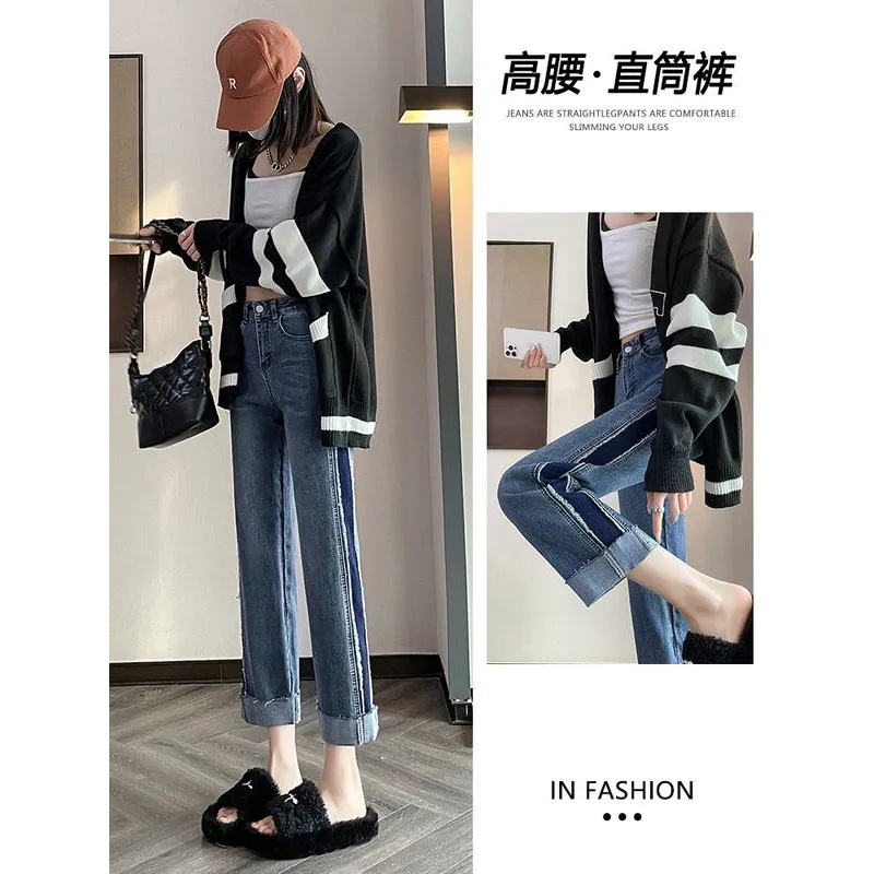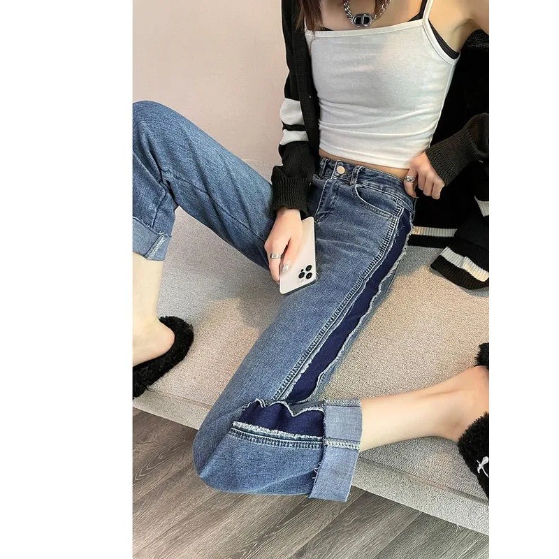 新款牛仔裤女撞色阔腿夏季梨型身材高腰宽松小个子九分烟管裤