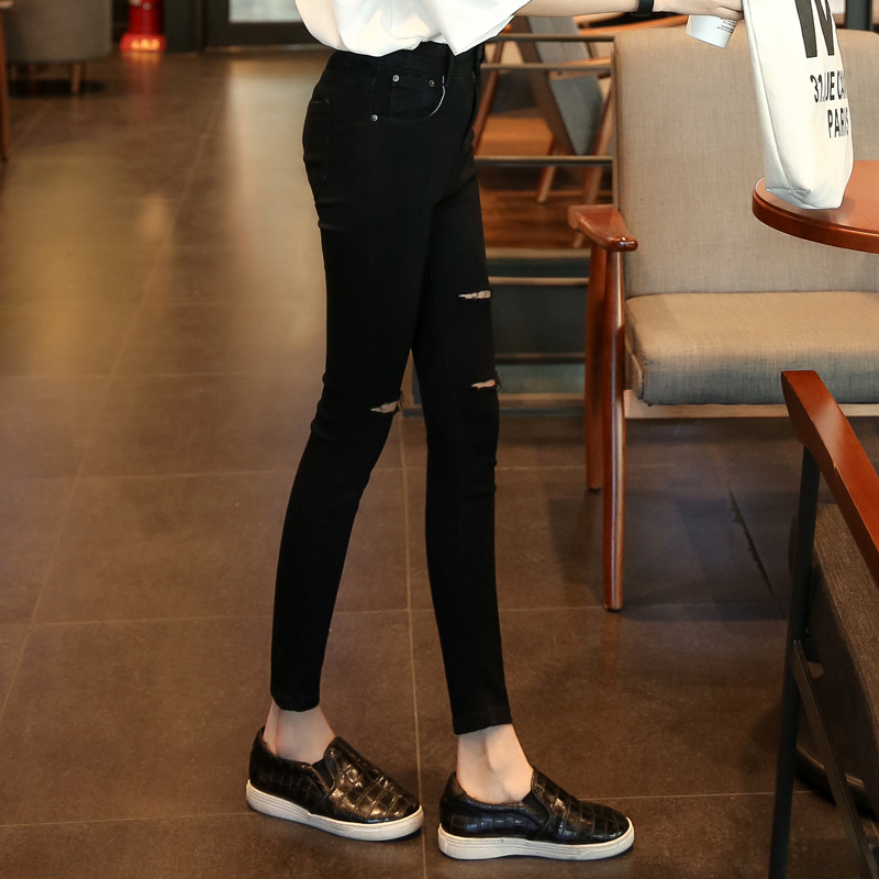 牛仔裤女春夏新款女式高腰破洞牛仔裤九分裤韩版修身弹力小脚裤子