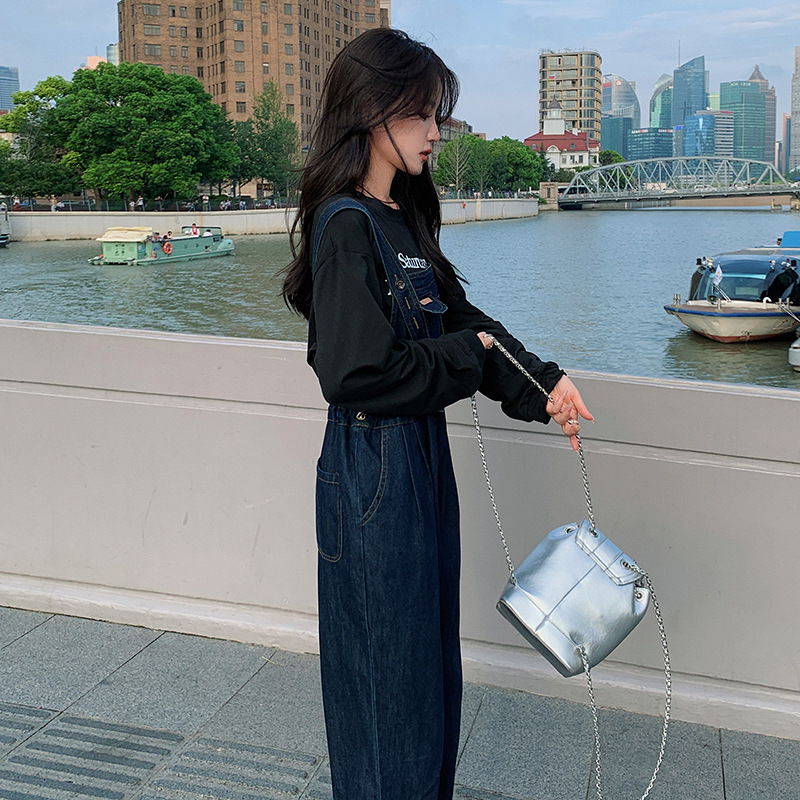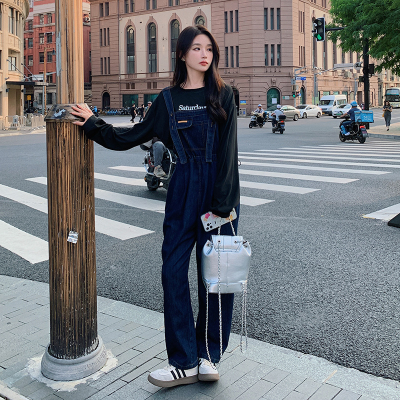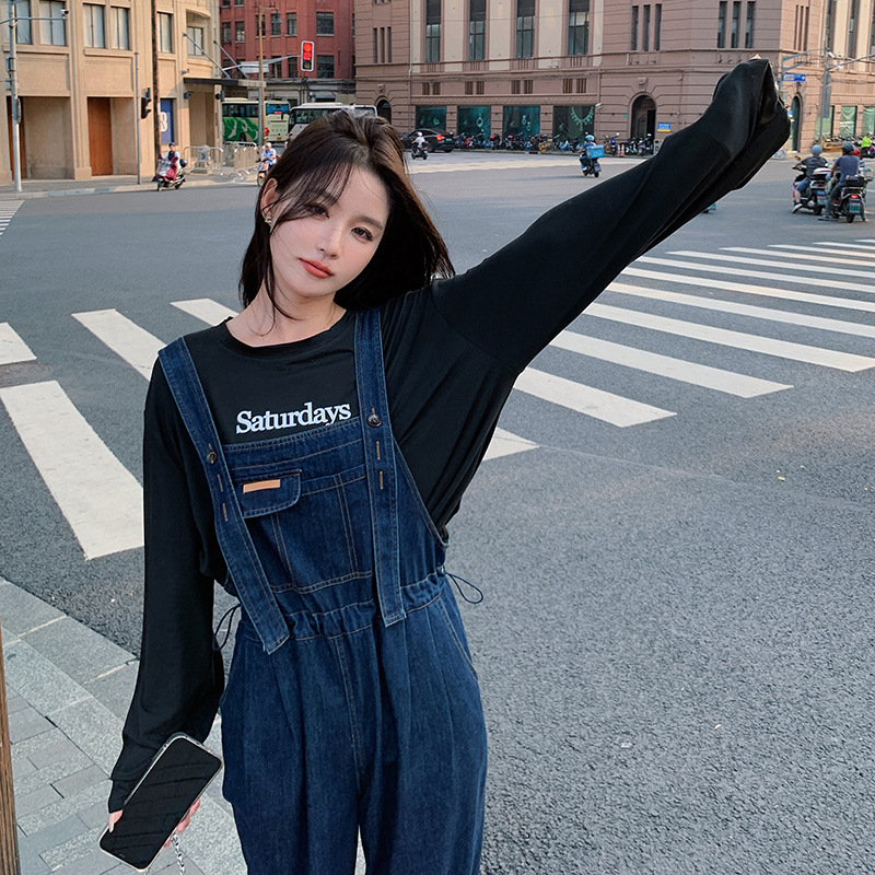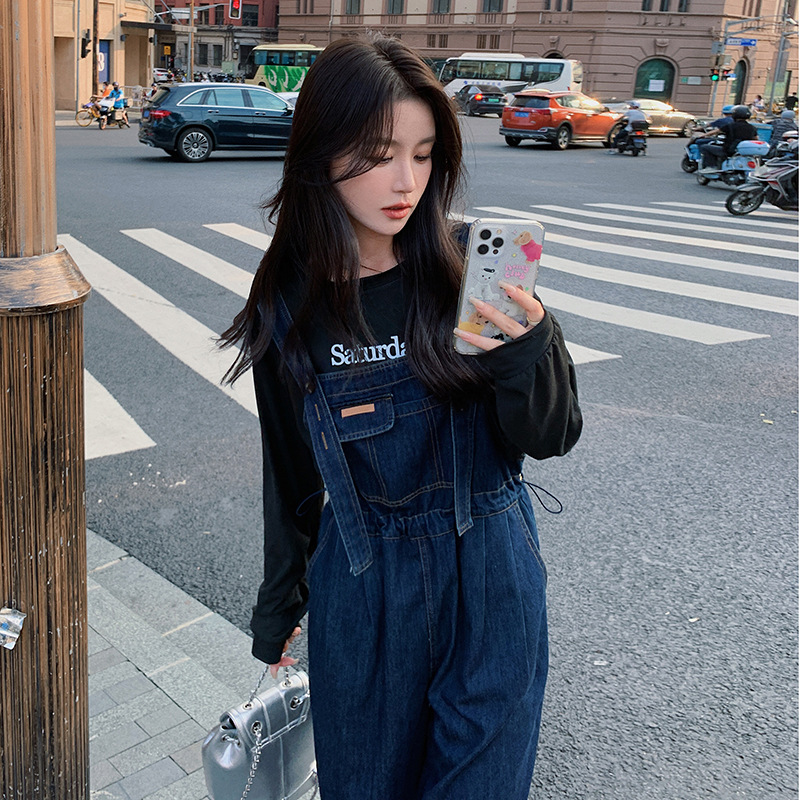 实拍法式复古减龄牛仔背带裤女秋款夏收腰显瘦宽松休闲连体裤