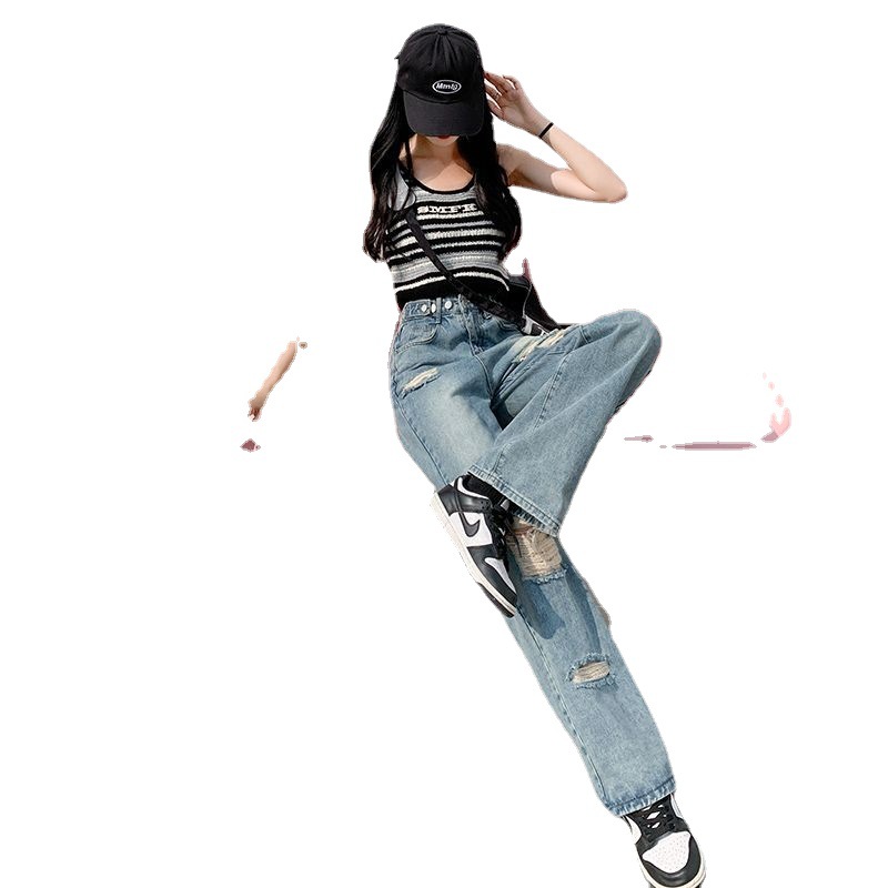 牛仔裤直筒女腰部可调节破洞春夏年新款显瘦宽松高腰阔腿裤子
