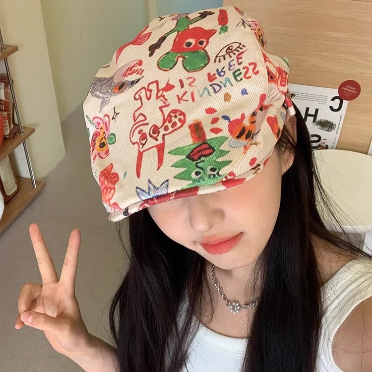 日系可爱涂鸦前进帽女个性复古童趣贝雷帽搞怪短檐画家帽子百搭潮