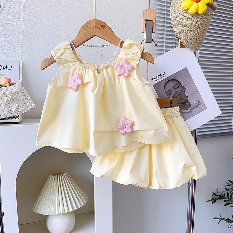 夏季女童套装宝宝洋气儿童个性潮可爱韩版花朵背心娃娃衫花苞短裤