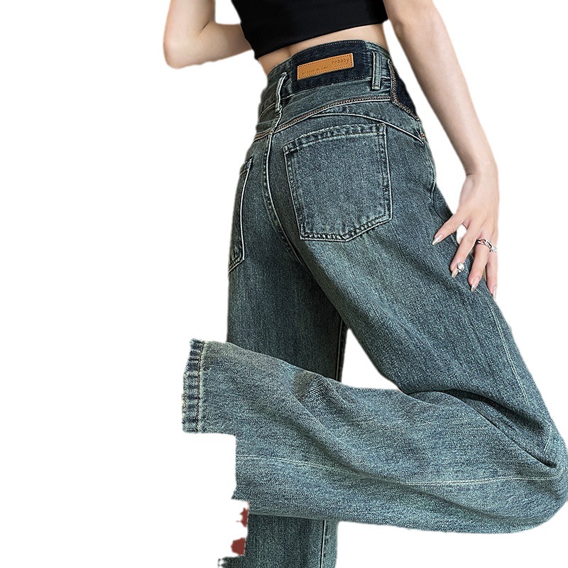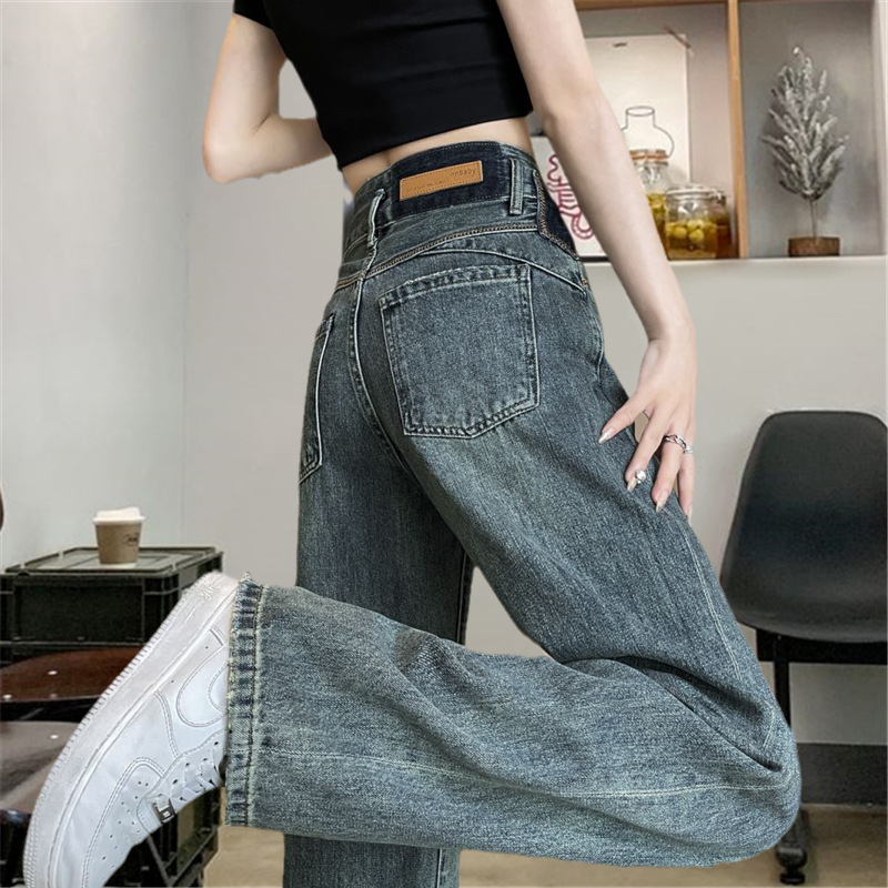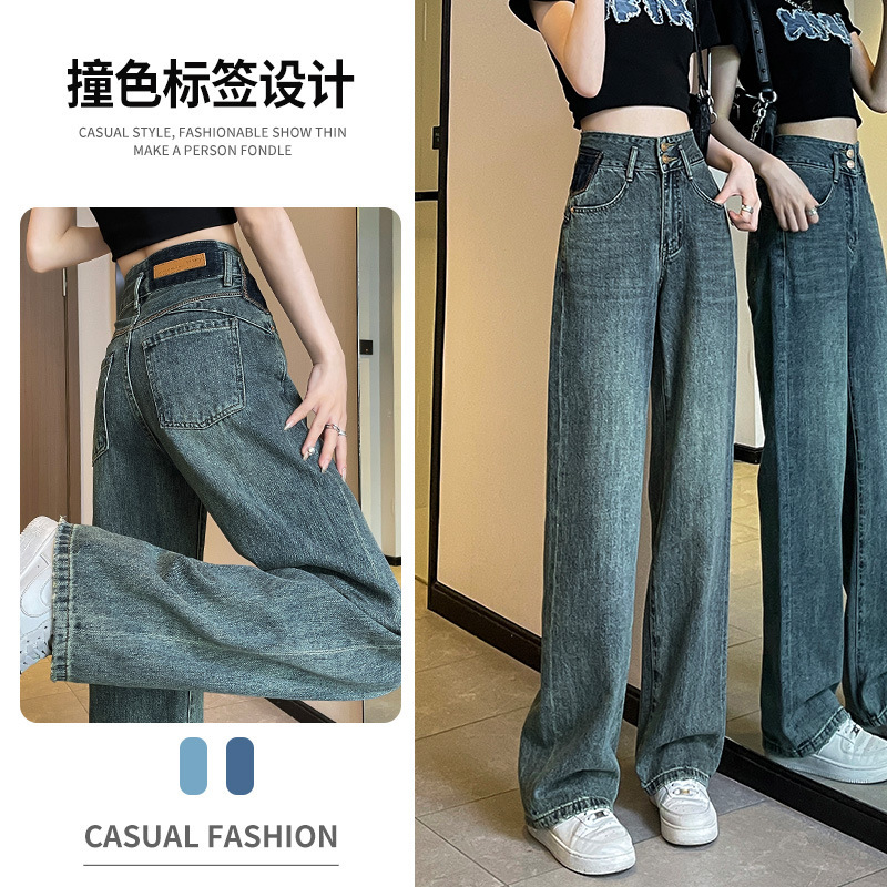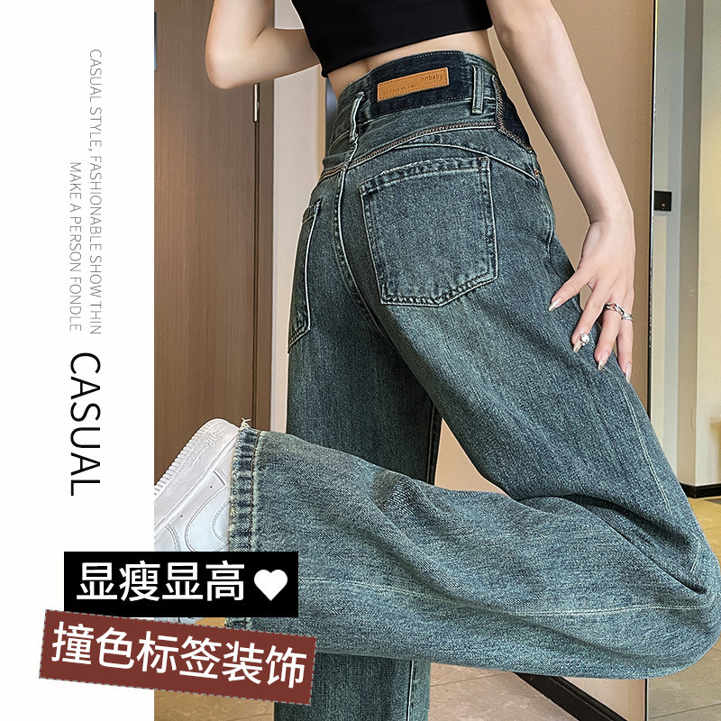 窄版阔腿牛仔裤女夏季薄款新款撞色高腰设计感宽松直筒裤子女