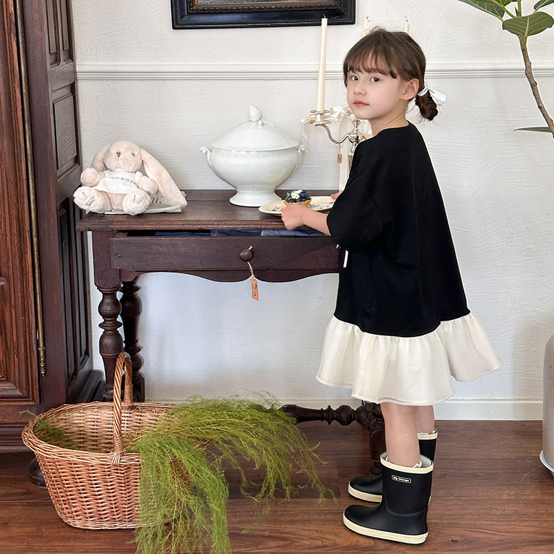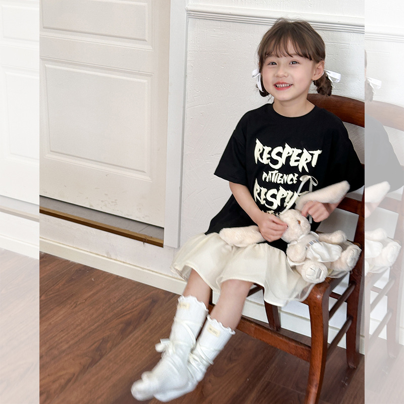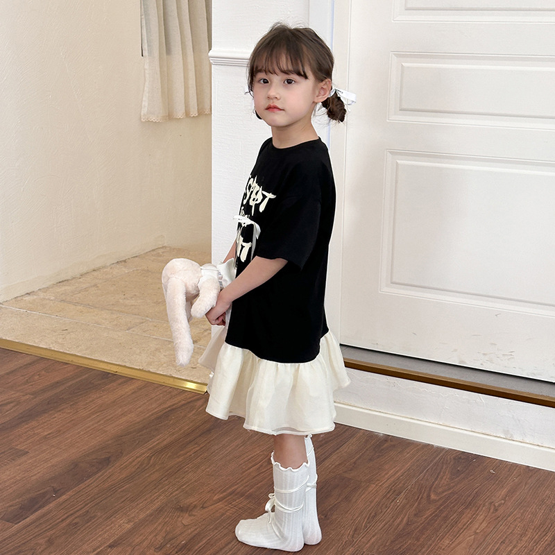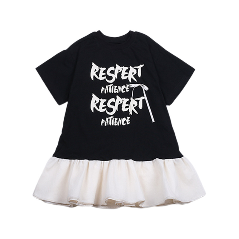 艾摩贝贝女童时髦设计感真蝴蝶结系带短袖连衣裙字母假两件荷叶裙